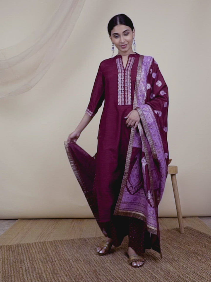 Purple Solid Silk Straight Kurta With Palazzos & Dupatta