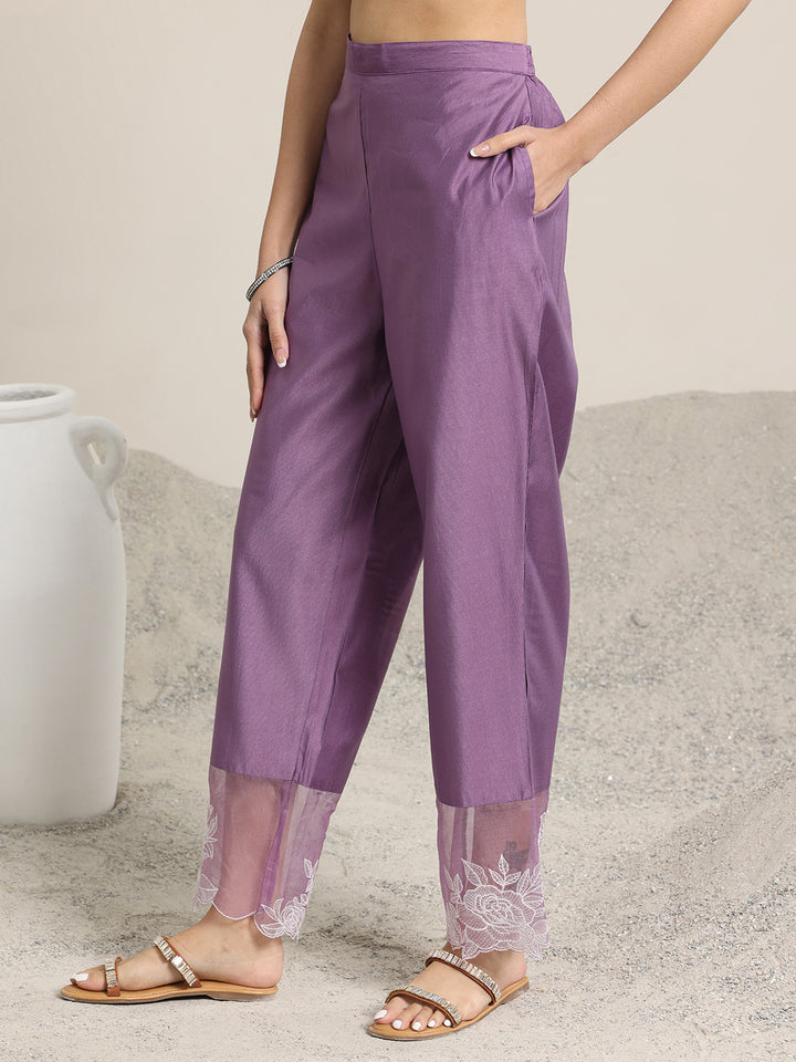 Our 3-piece purple yoke design silk blend straight suit set features a kurta with a notched neckline and full-length flared sleeves. Complemented with trousers with a partially elasticated waistband and roomy pockets, and a dupatta. Highlighted with floral prints, beaded accents, and thread work, this style is perfect for light festivities.