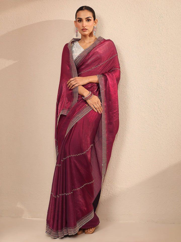 Our magenta silk blend saree features captivating embellishments. Complemented with an unstitched blouse piece. This charming saree is perfect for festive occasions.