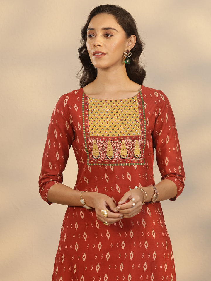 Our 3-piece Red and Yellow Cotton Straight-Fit Kurta Set features a Round Neckline, Regular Sleeves, and statement Yoke. Complemented with Straight Pants with a Partially Elasticated waistband and 2 pockets, and a Printed Dupatta. Adorned with Ethnic Motif Printed, this style is perfect for Festive occasions.
