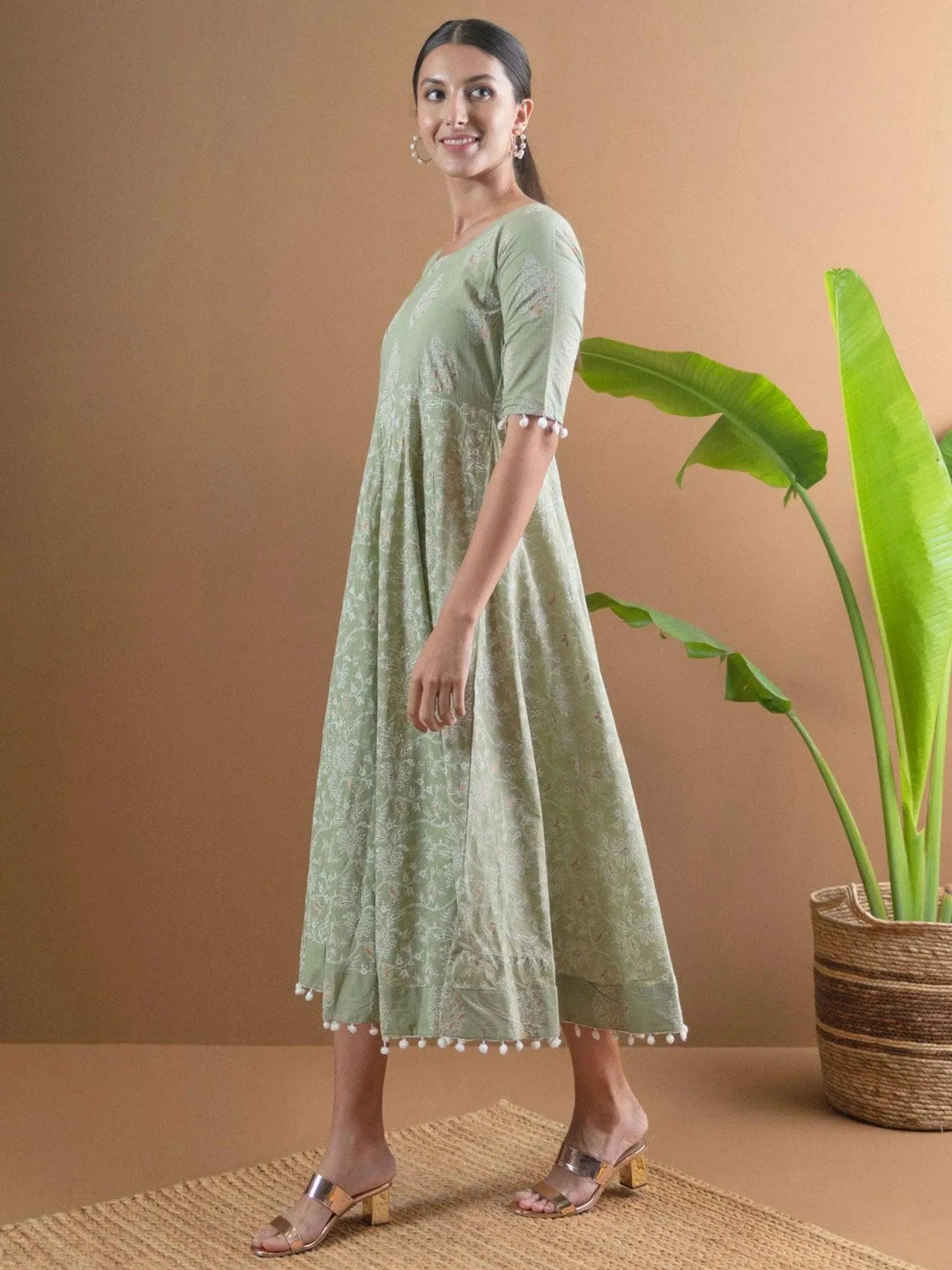 Our sage green printed maxi dress features a flared hemline, round neckline, and three-quarter sleeves. Complemented with a mask. Adorned with captivating floral prints and tassels, this style is perfect for casual outings.