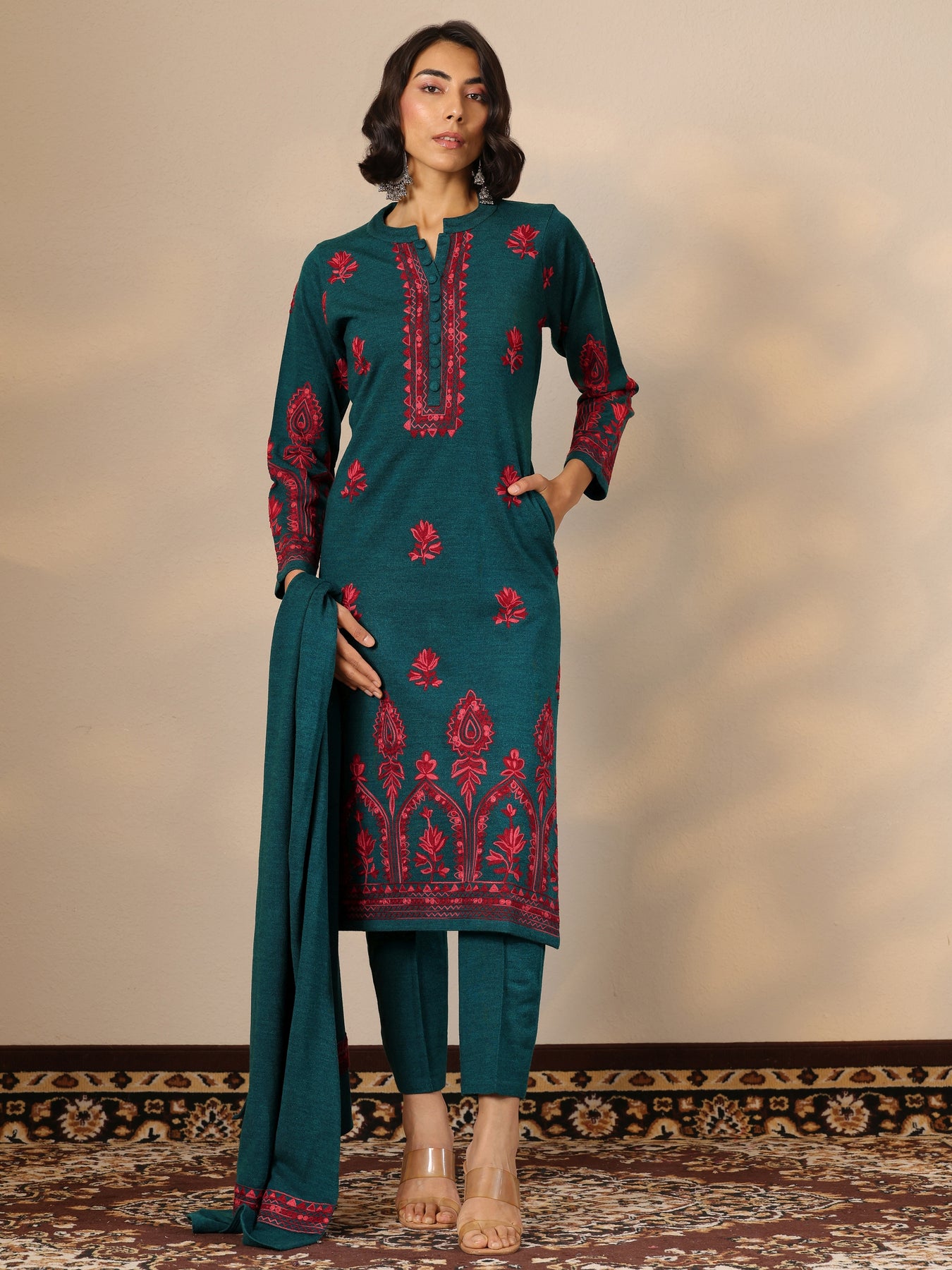Green Embroidered Wool Straight Suit Set With Dupatta