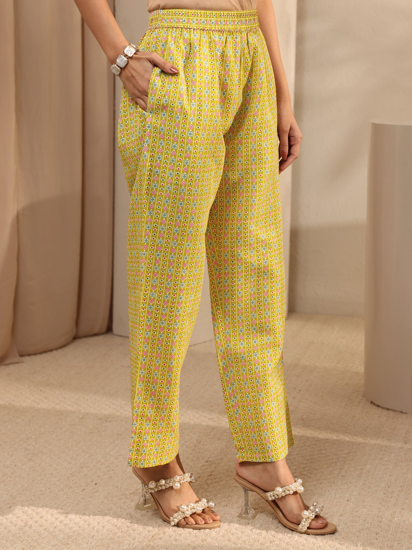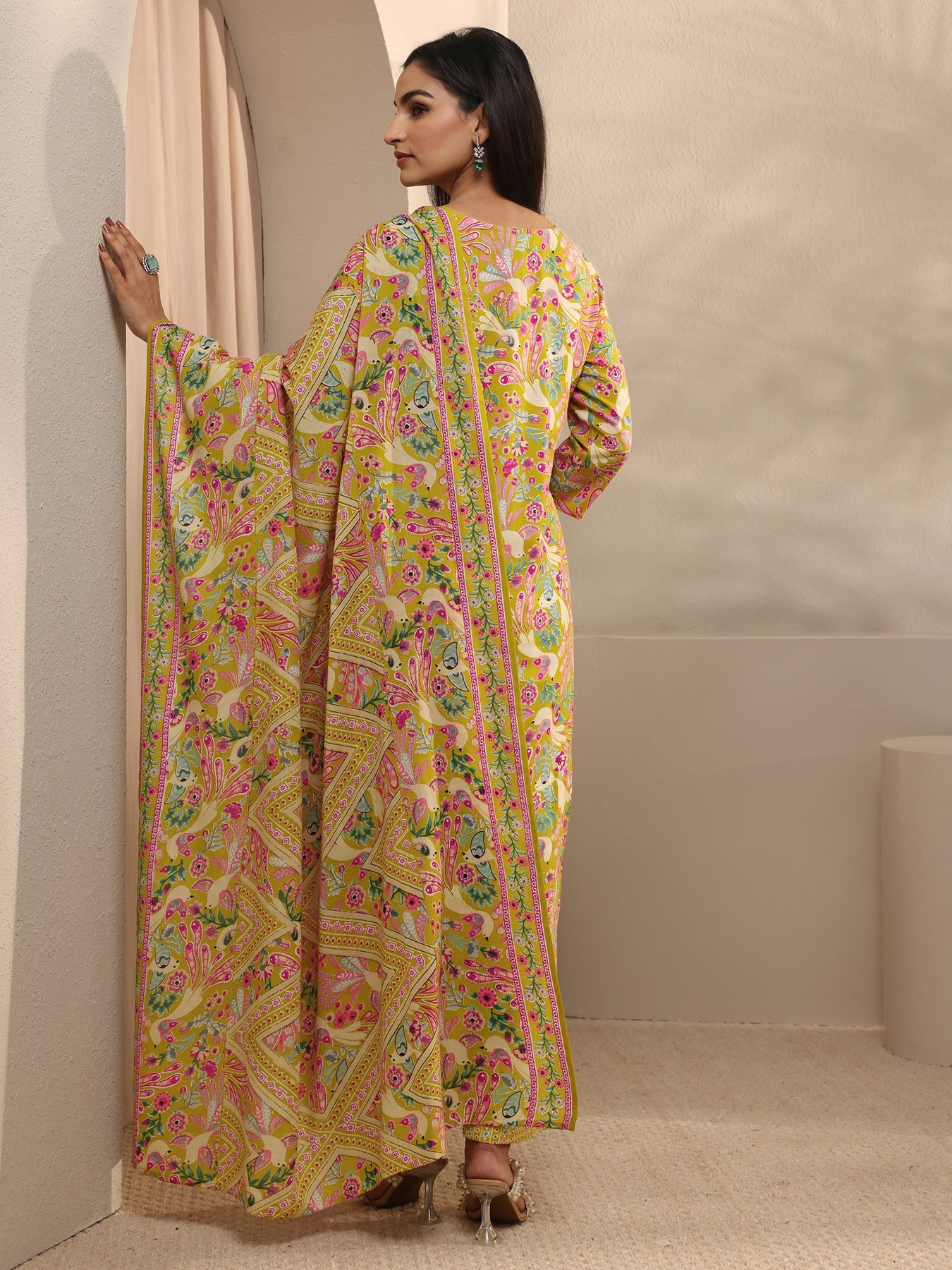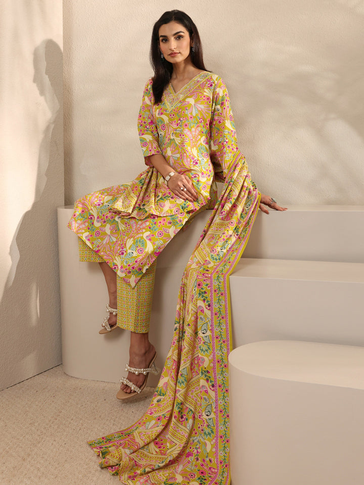 Our 3-piece yellow cotton straight-fit kurta set features a V-neckline, regular sleeves, and statement yoke. Complemented with straight pants with a partially elasticated waistband and 2 pockets, and a floral dupatta. Adorned with floral Printed, this style is perfect for festive occasions.