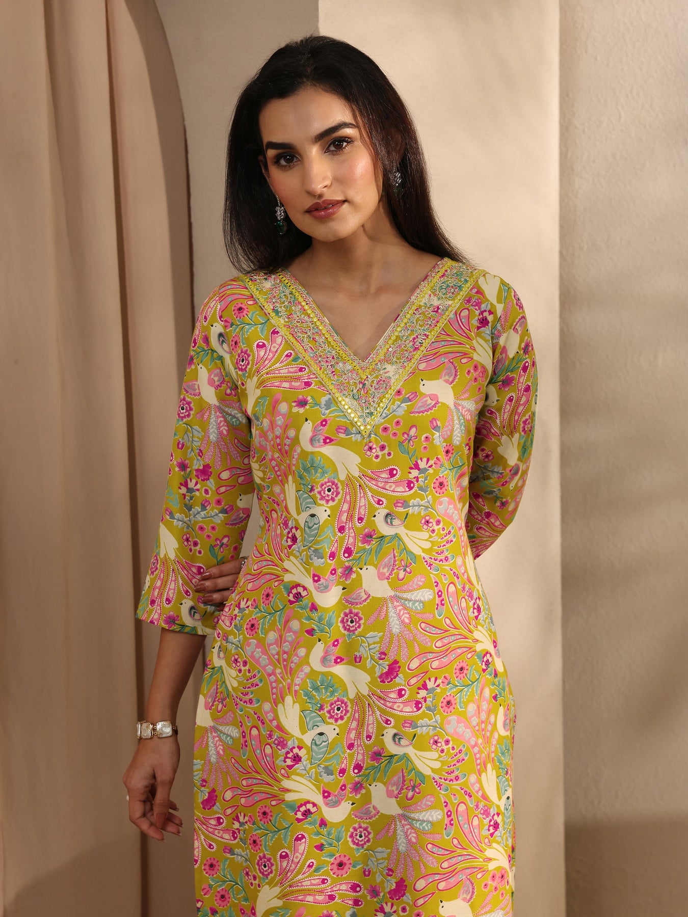 Pair this floral kurta with elegant earrings, a chic clutch, and embellished sandals for festive occasions.