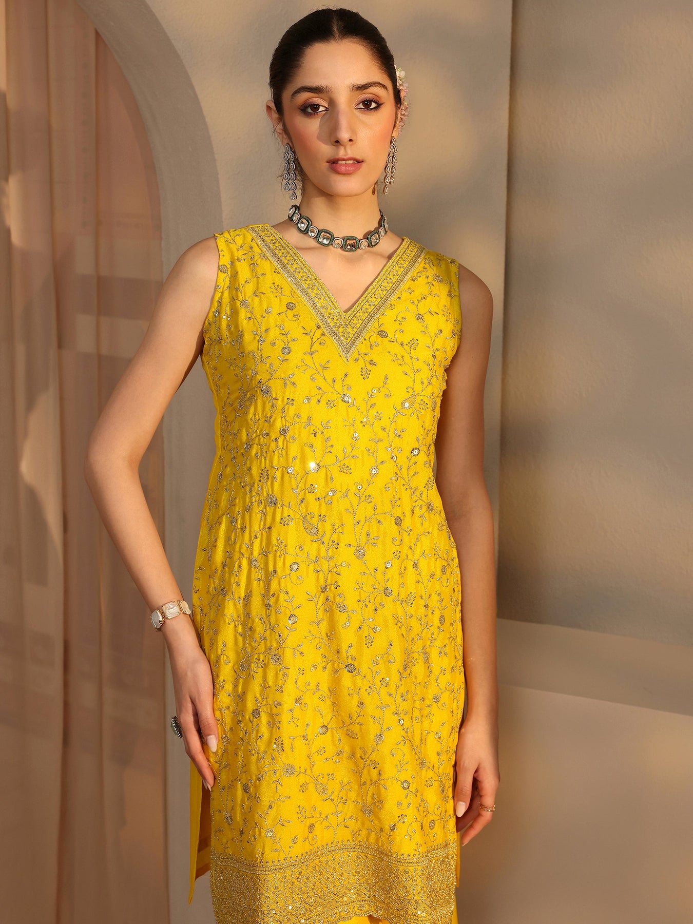 Our 3-piece yellow Chinon straight-fit kurta set features a V-neckline and statement yoke. Complemented with lining and palazzo pants with a partially elasticated waistband, and an embroidered dupatta. Adorned with floral zari embroidered, this style is perfect for festive occasions.
