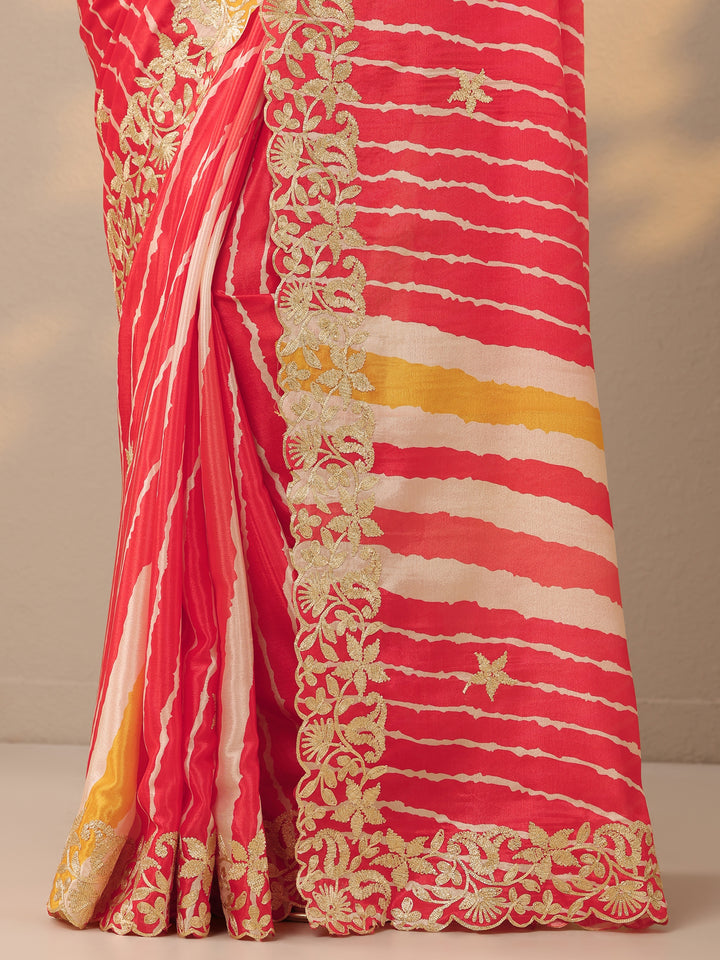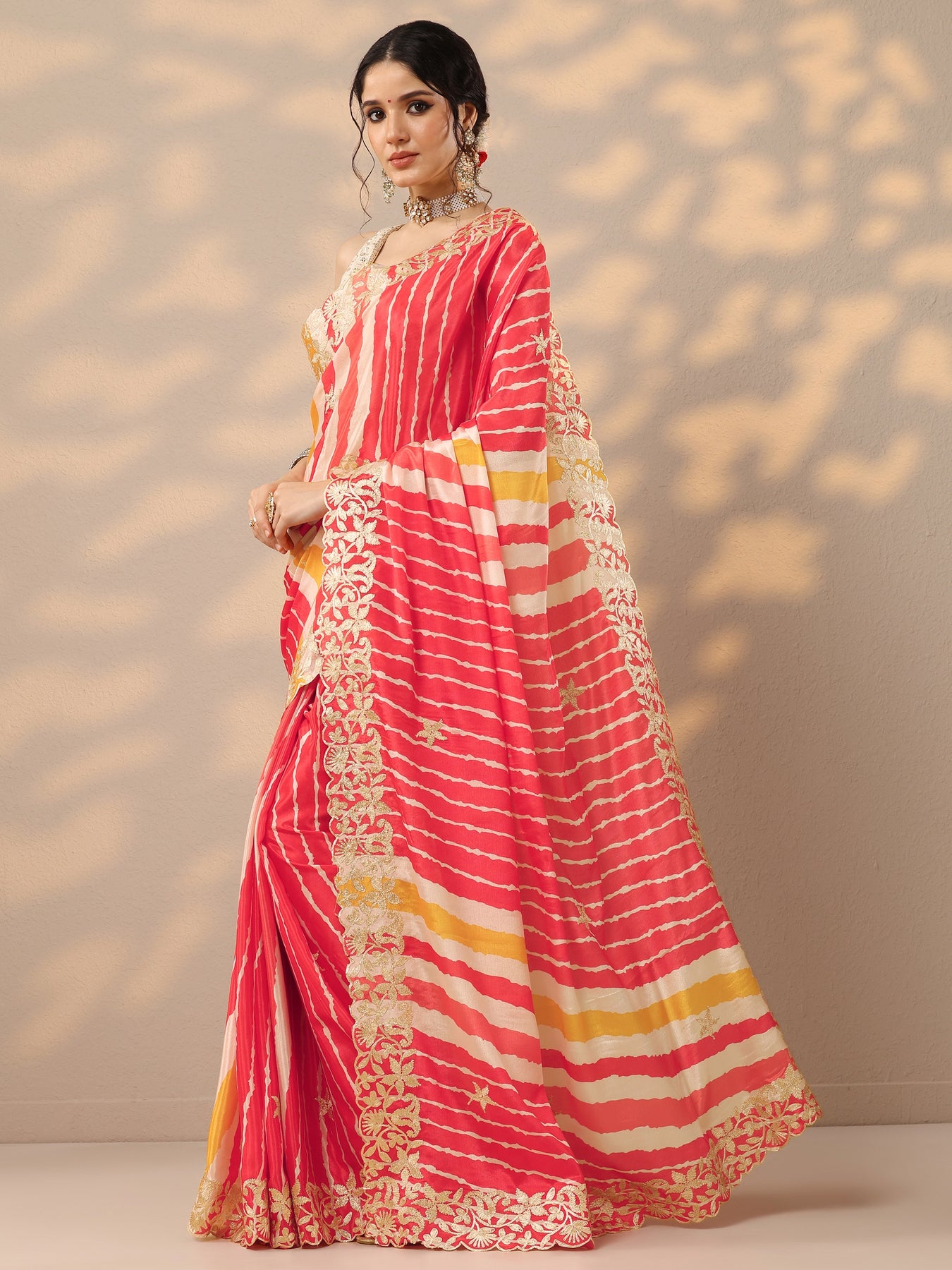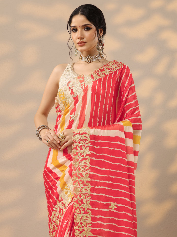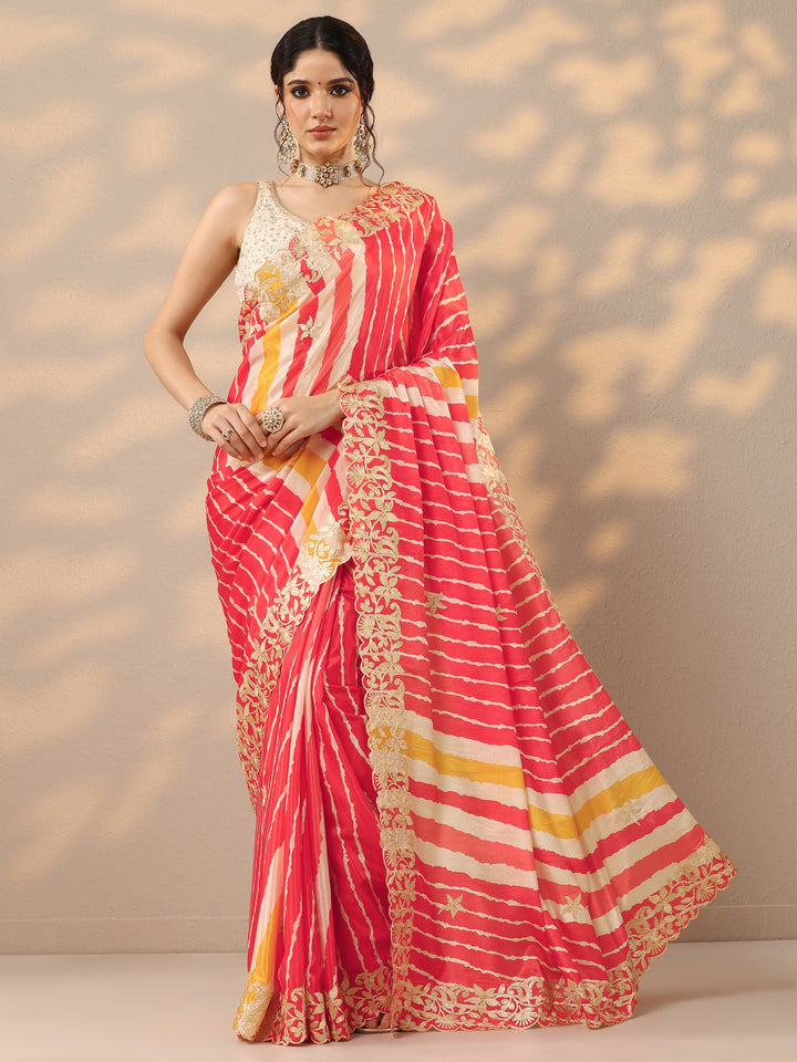Our Red Printed Chinon Saree Features Captivating Leheriya-Inspired Print. Complemented With An Unstitched Blouse Piece. This Charming Saree Is Perfect For Festive Occasions
