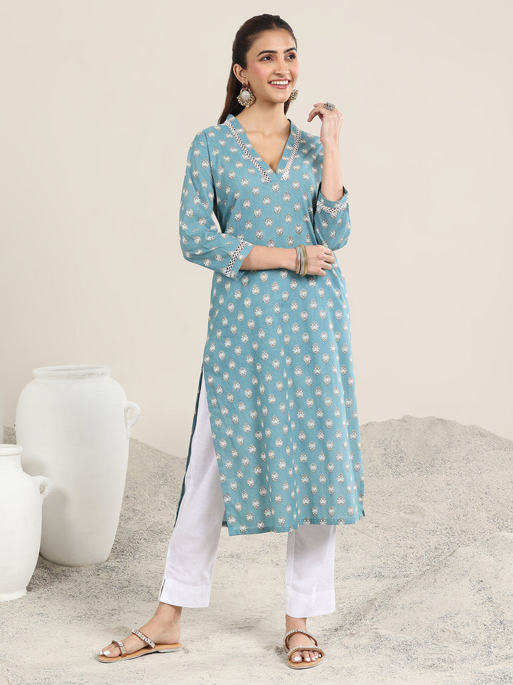 Our 1-piece sea green cotton straight-fit kurta features a V-neckline, regular sleeves and statement Yoke. Adorned with printed embellishments, this style is perfect for casual wear.