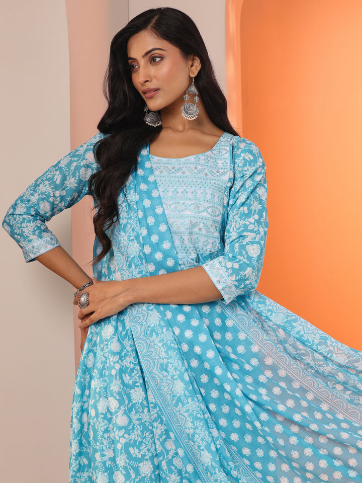 Blue Printed Cotton Straight Suit Set With Dupatta
