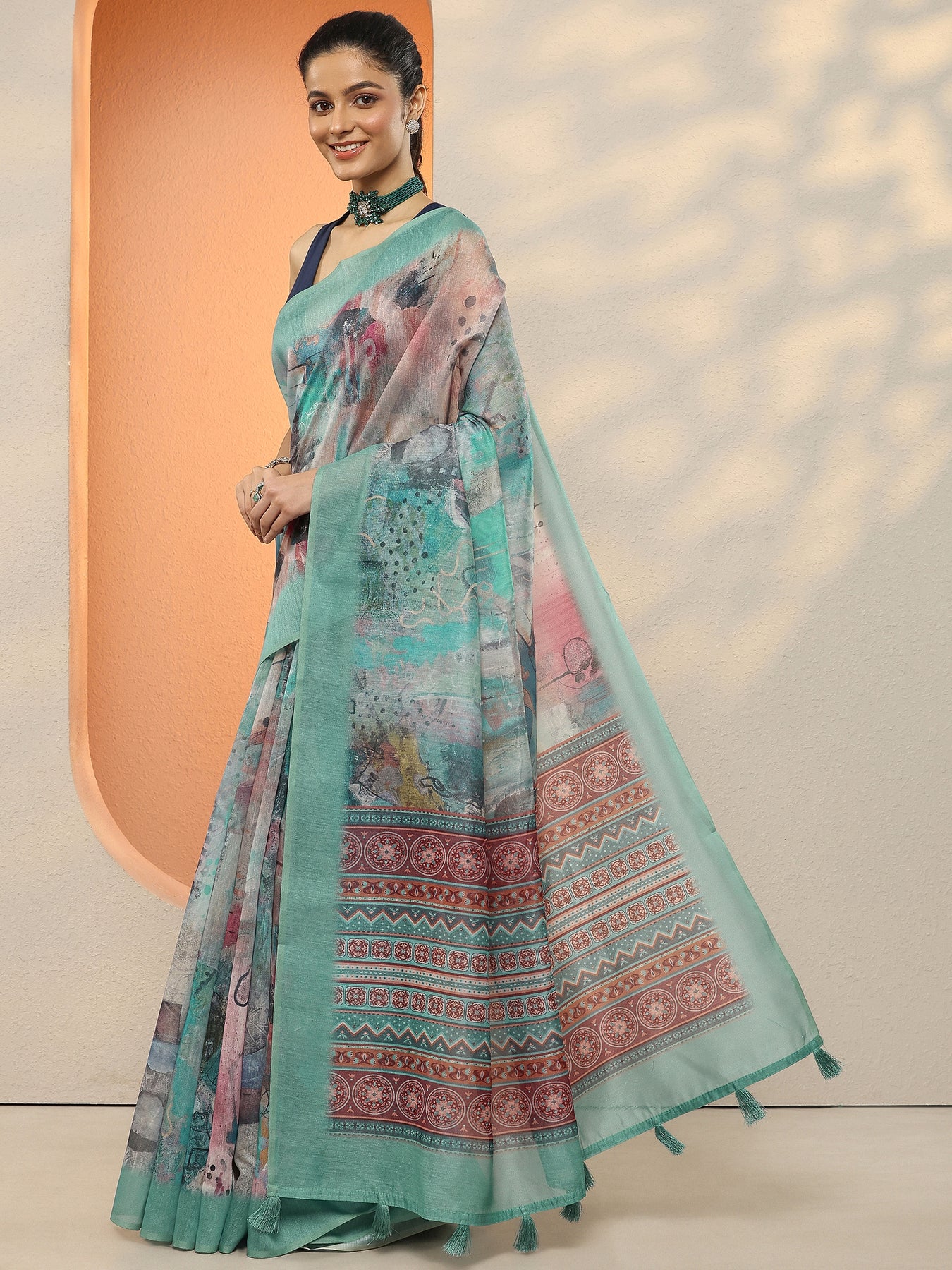 Blue Printed Silk Blend Sarees With Unstitched Blouse Piece