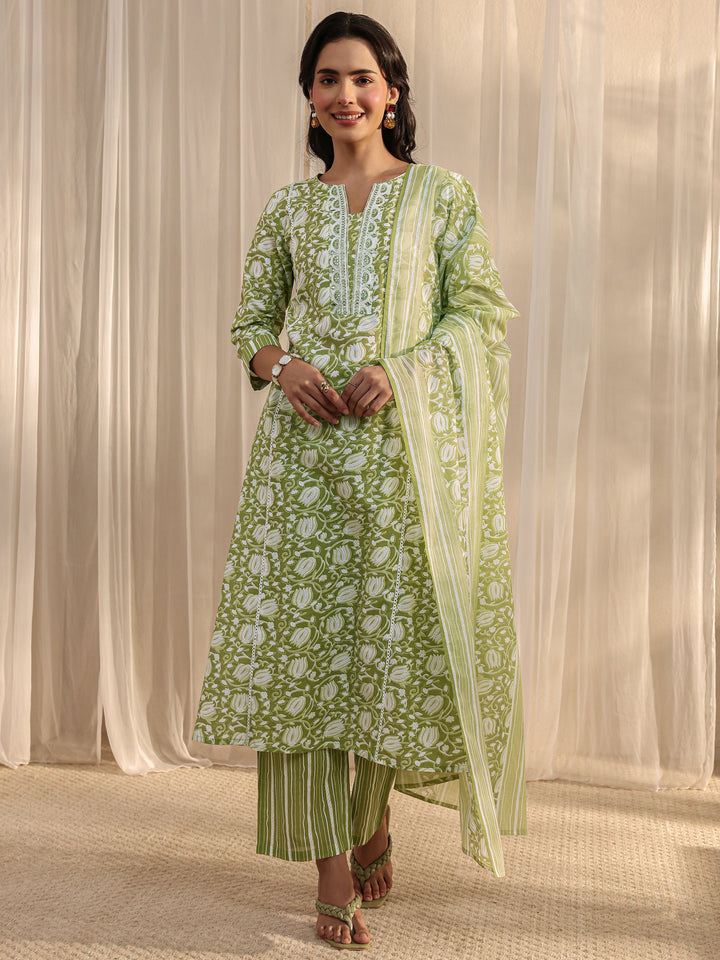 Green Floral Printed Cotton A-Line Suit Set With Dupatta