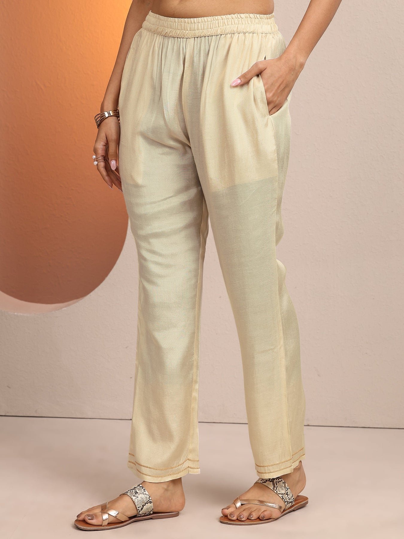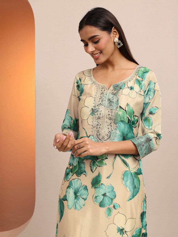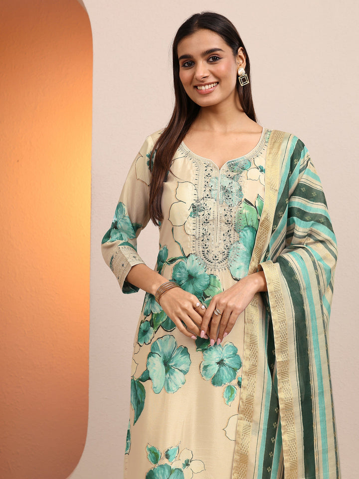 Our 3-piece beige silk blend straight-fit kurta set features a sweetheart neckline, regular sleeves, and statement yoke. Complemented with straight pants with a partially elasticated waistband and 2 pockets, and a printed dupatta. Adorned with floral printed, this style is perfect for Work Wear and Casual Wear.