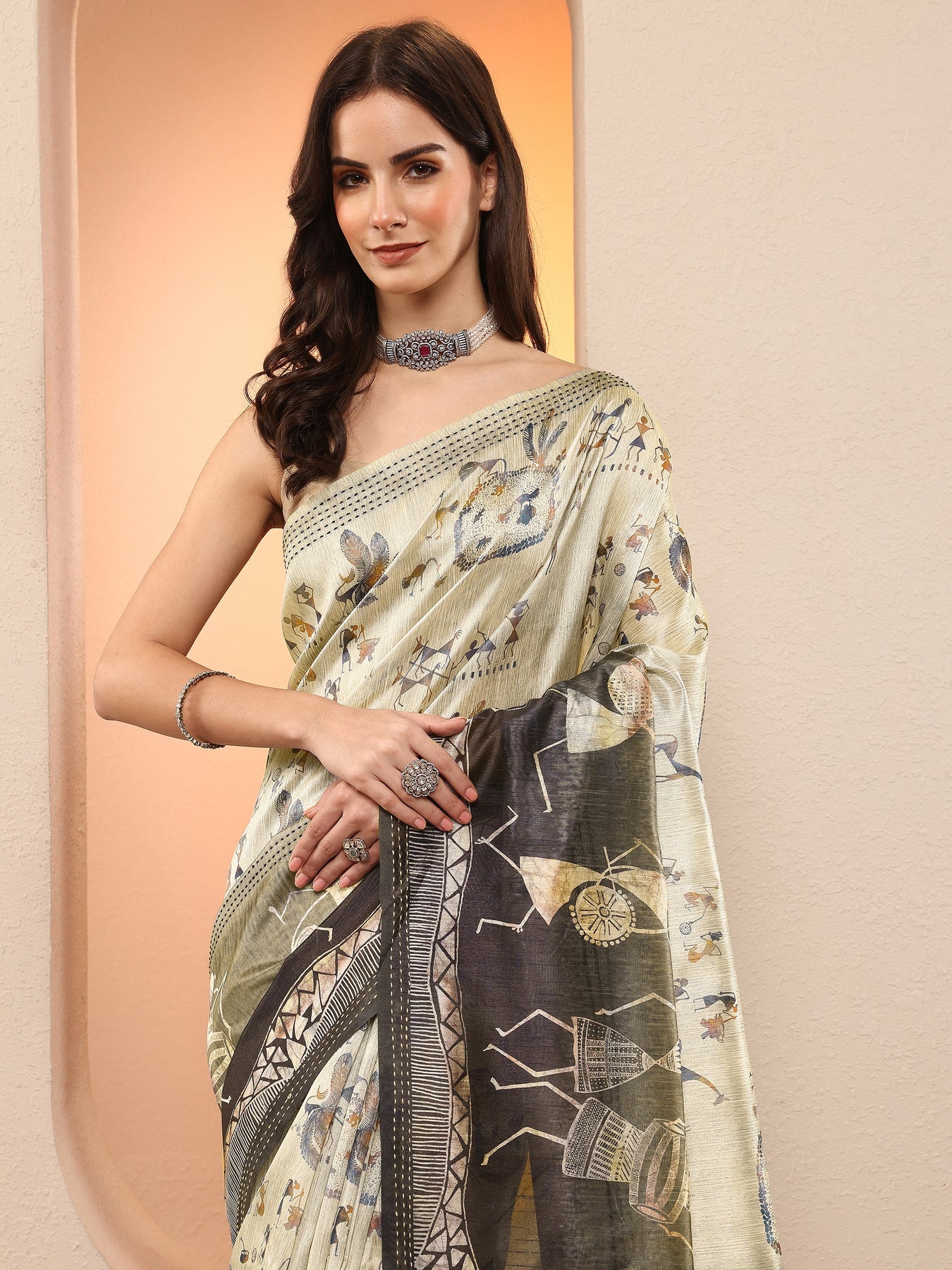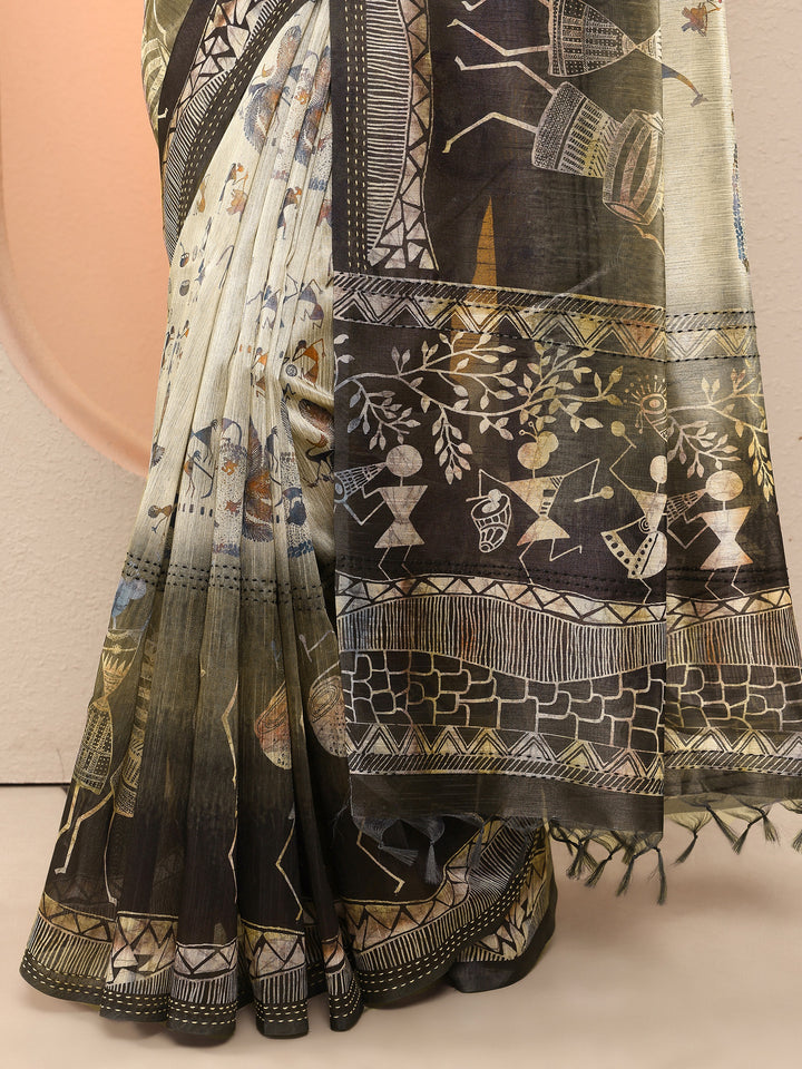 Green Tribal Printed Sarees With Unstitched Blouse Piece