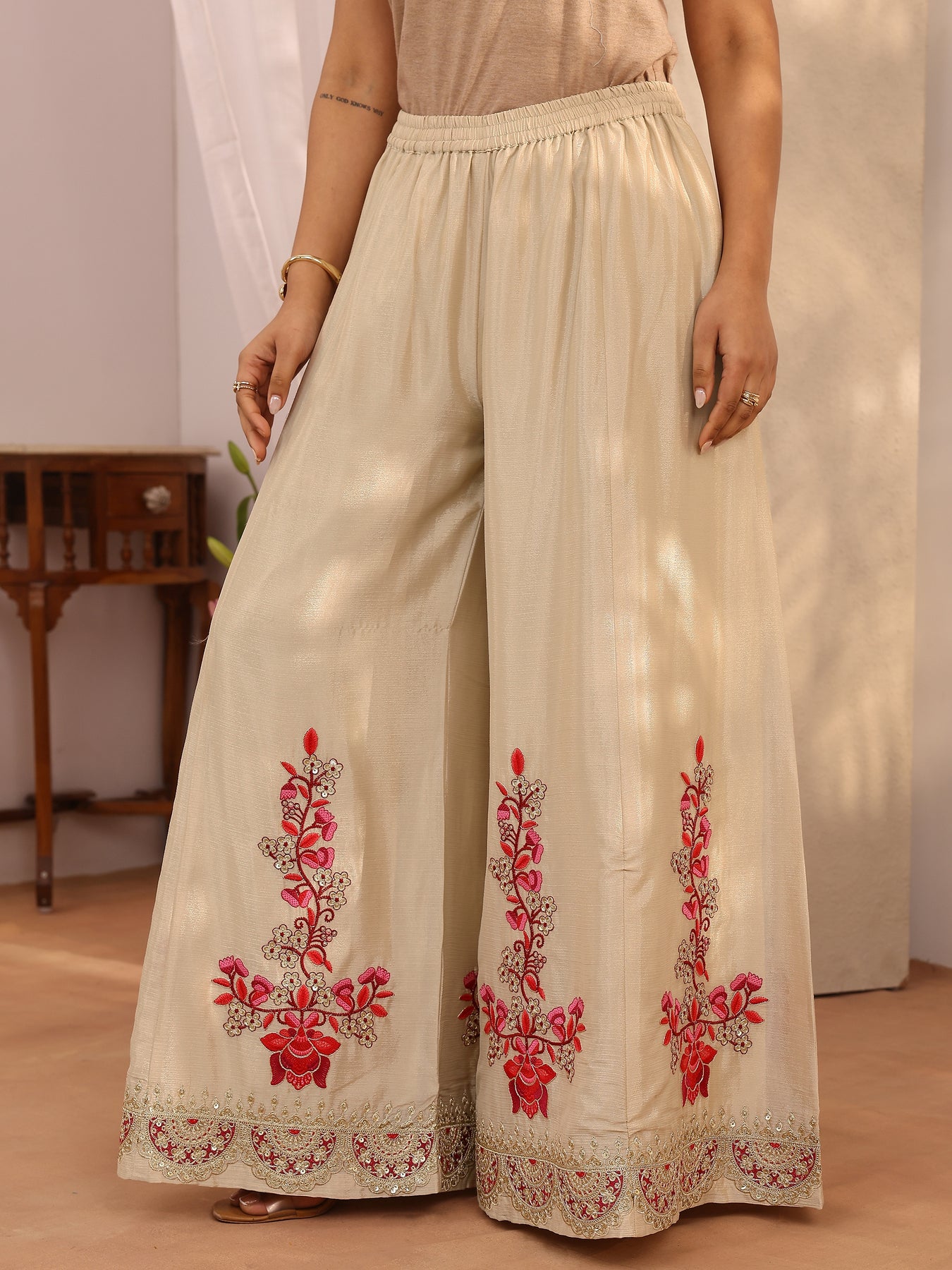 Our 3-piece Beige Chinon Straight-Fit Kurta Set features a sweetheart neck, Regular Sleeves, and statement yoke. Complemented with Flared Palazzo Pants with a Partially Elasticated waistband, and an Embroidered dupatta. Adorned with floral embroidered, this style is perfect for Festive occasions.