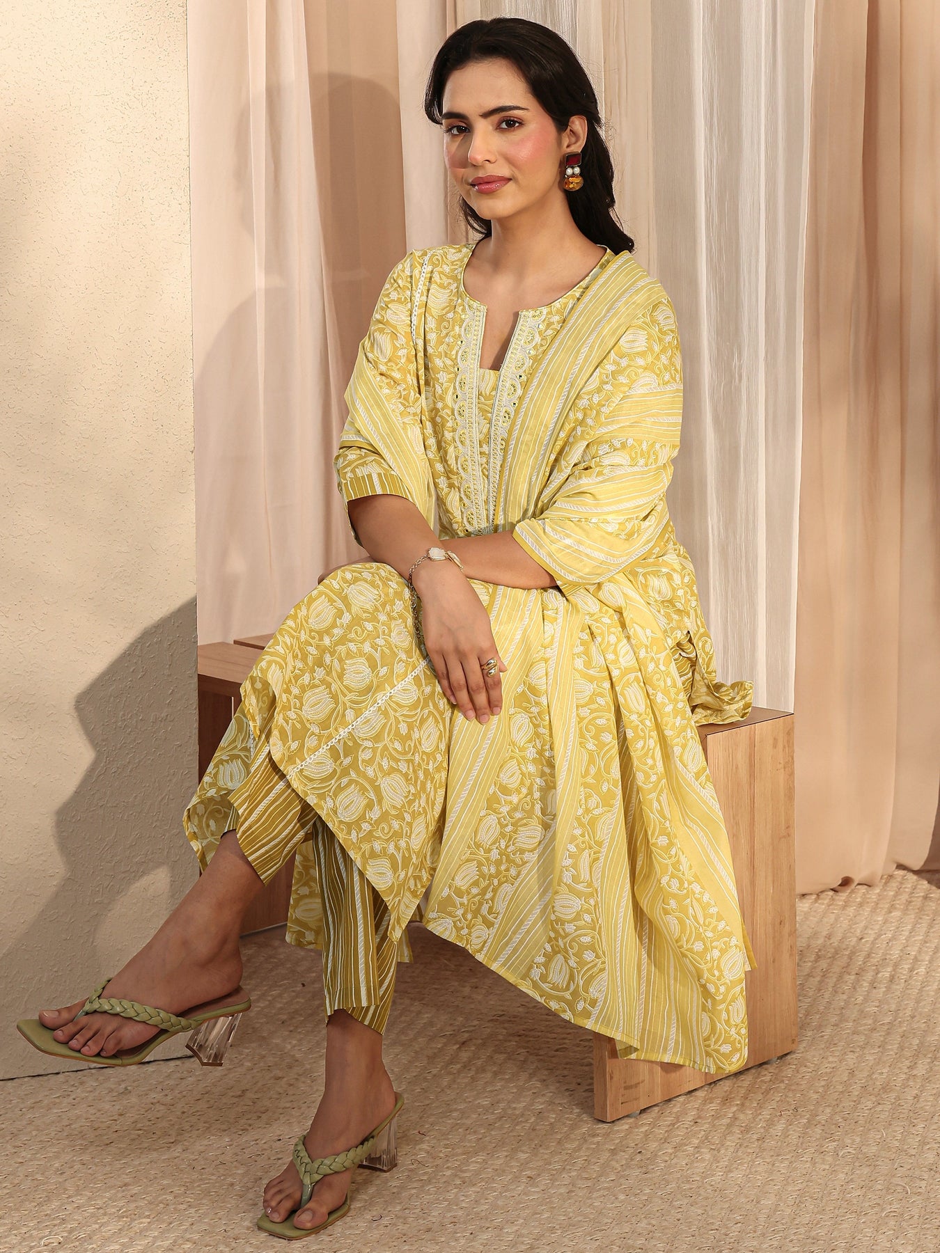 Our 3-piece yellow cotton straight-fit kurta set features a notched neckline, regular sleeves, and statement yoke. Complemented with straight pants with a partially elasticated waistband and 2 pockets, and a printed dupatta. Adorned with floral printed, this style is perfect for work wear and casual wear.