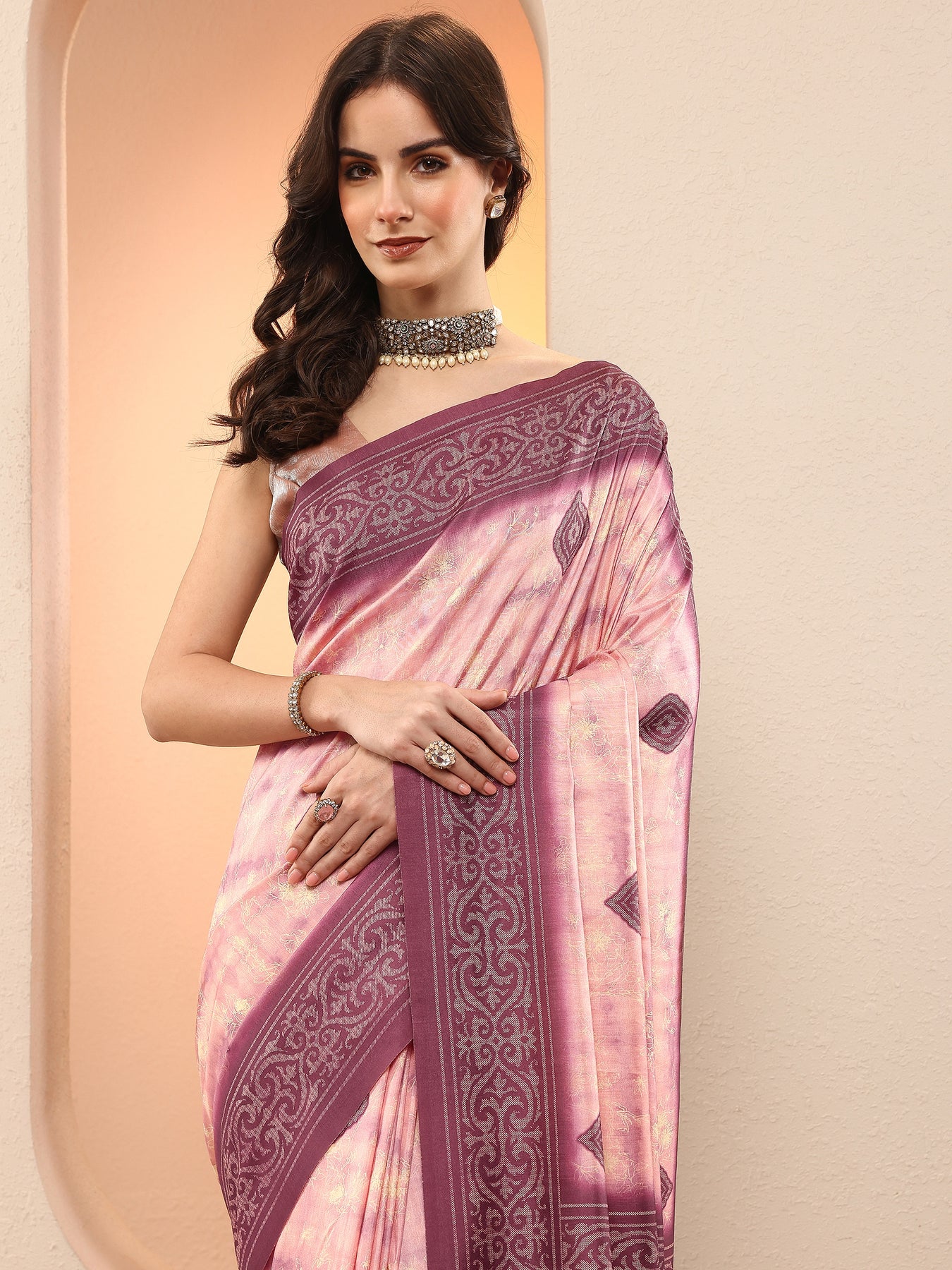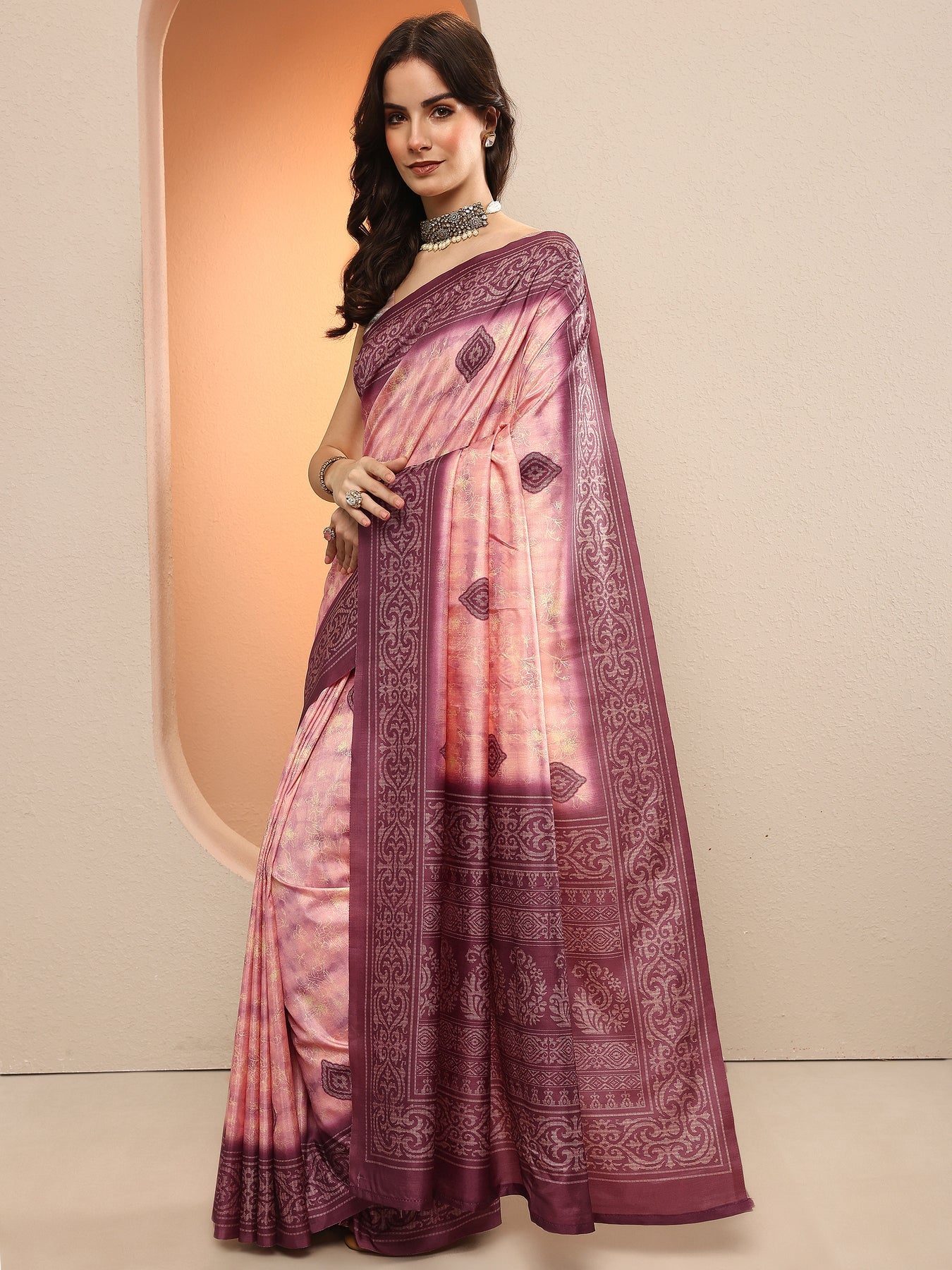 Mauve Printed Silk Blend Sarees With Unstitched Blouse Piece