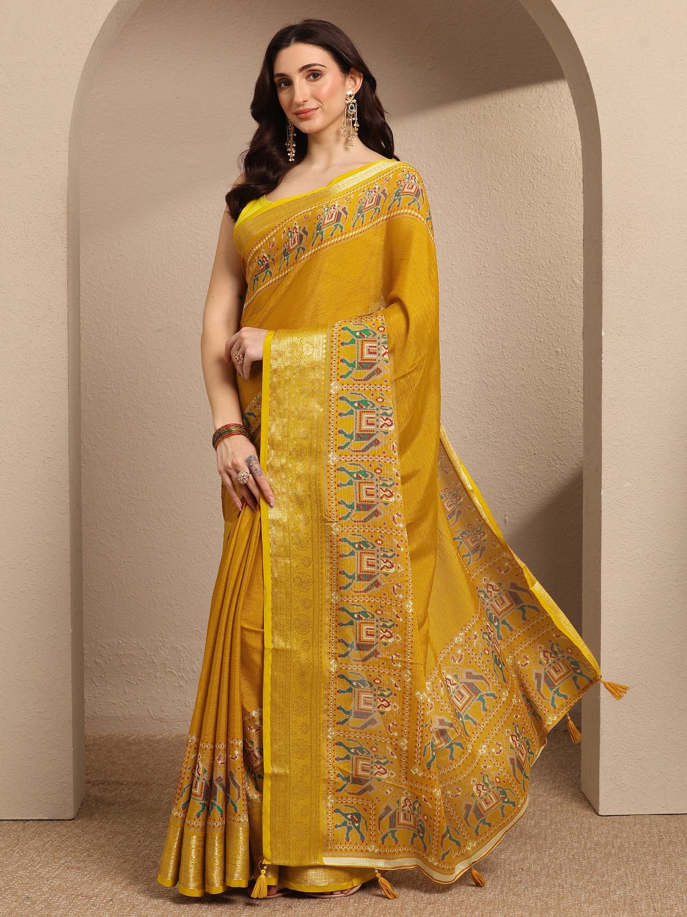 Our mustard printed georgette saree features captivating top print. Complemented with a Unstitched blouse piece.. This charming saree is perfect for occasion.