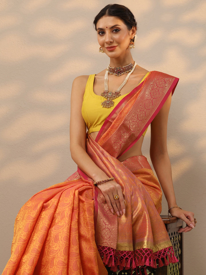 Our Orange Printed Silk Blend Saree Features Captivating Top Pattern. Complemented With An Unstitched Blouse Piece. This Charming Saree Is Perfect For Festive Occasions