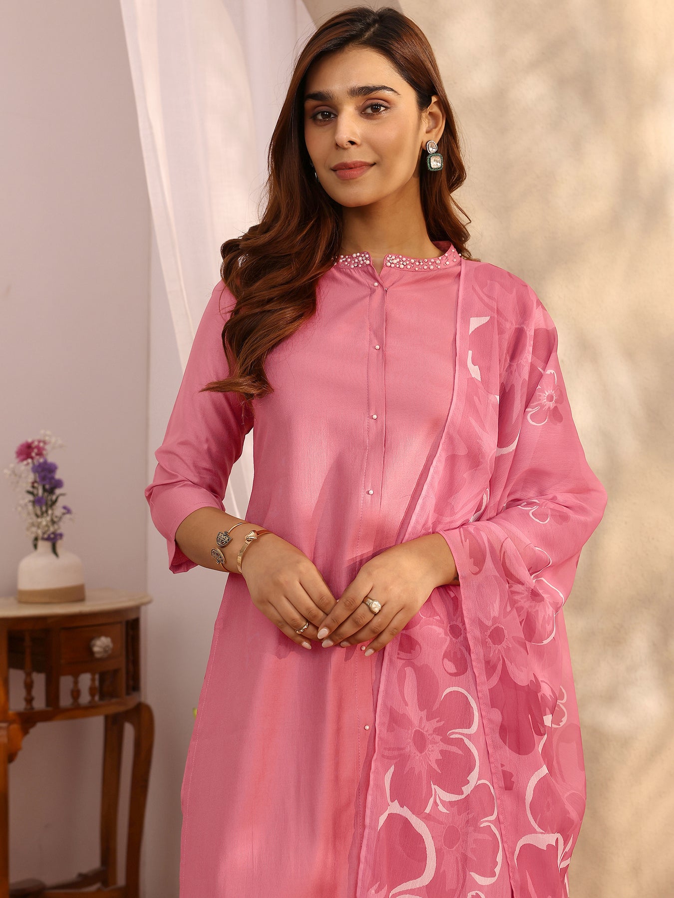 Our 3-piece Pink Silk blend Straight-fit Kurta Set features a Mandarin Collar neckline, Regular Sleeves, and statement yoke. Complemented with Straight Pants with a Partially Elasticated waistband, and a Printed dupatta. Adorned with floral embellished, this style is perfect for Festive occasions.