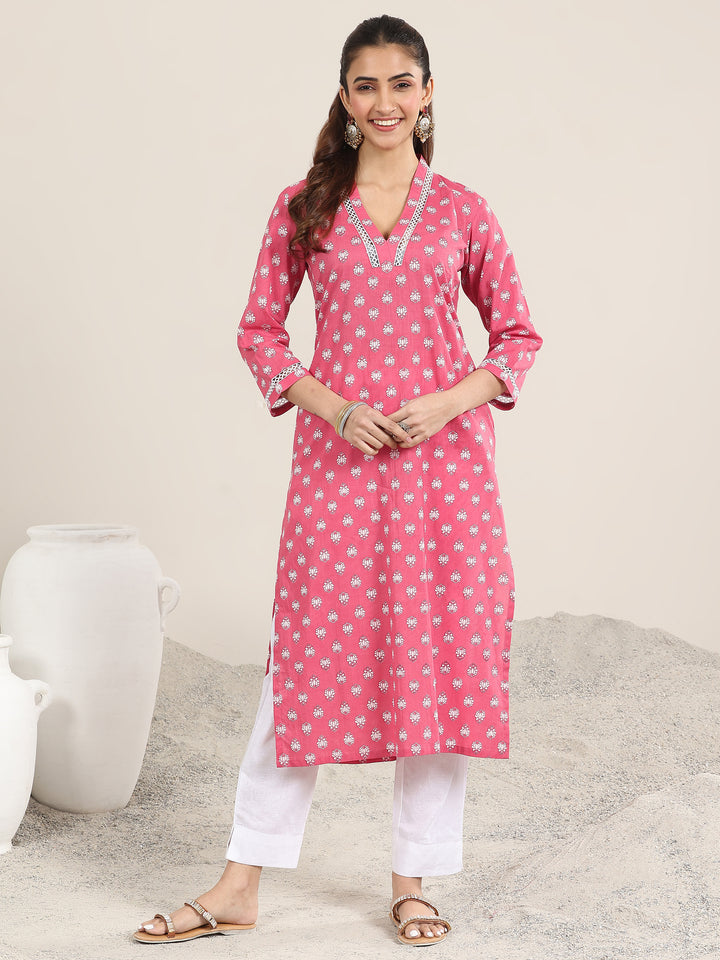 Our 1-piece pink cotton straight-fit kurta features a mandarin collar neckline, regular sleeves, and statement Yoke. Adorned with printed embellishments, this style is perfect for casual wear.