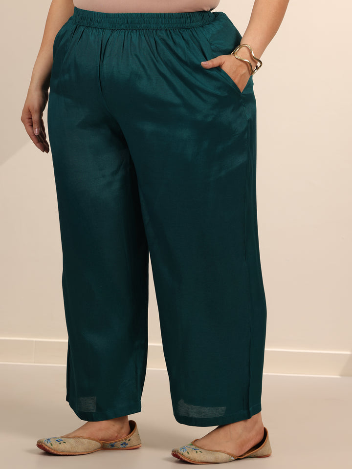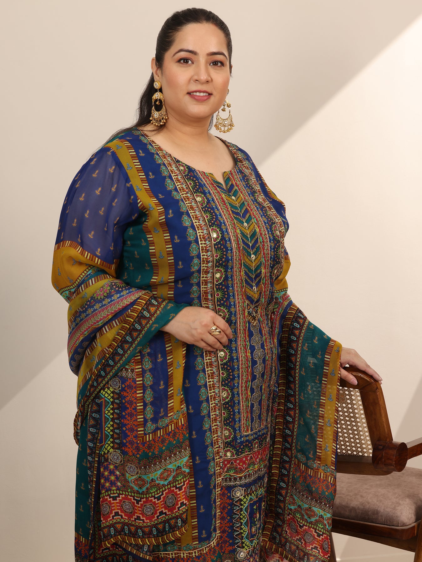 Libas Extra Love collection features our signature designs in comfortable plus sizes. Our 3-piece blue organza kurta set features a straight-fit design with a round neckline, regular sleeves, and a statement yoke. Complemented with straight palazzo pants with an elasticated waistband and 2 pockets, and a printed dupatta. Adorned with printed embellishments, this style is perfect for festive occasions.