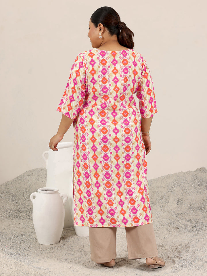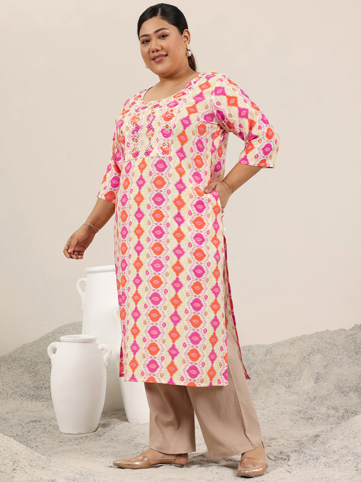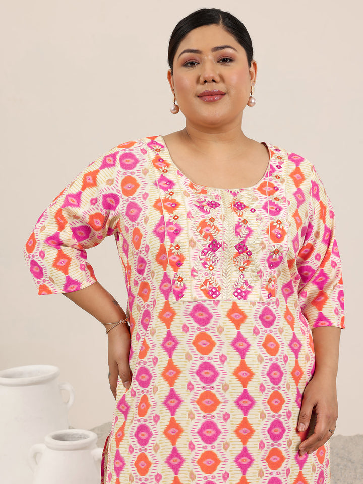 Libas Extra Love collection features our signature designs in comfortable plus sizes. Our off white silk printed straight kurta features a round neckline, three-quarter sleeves, and a statement yoke. Highlighted with block prints and roomy pockets, this style is ideal for light festivities.