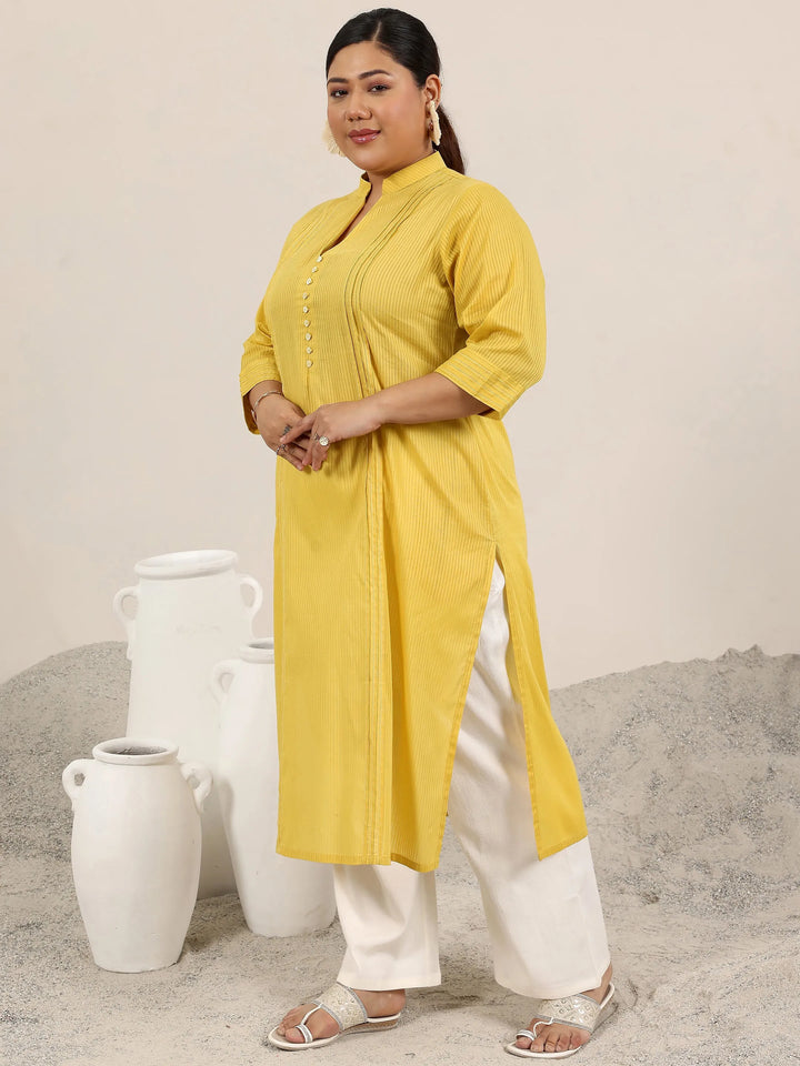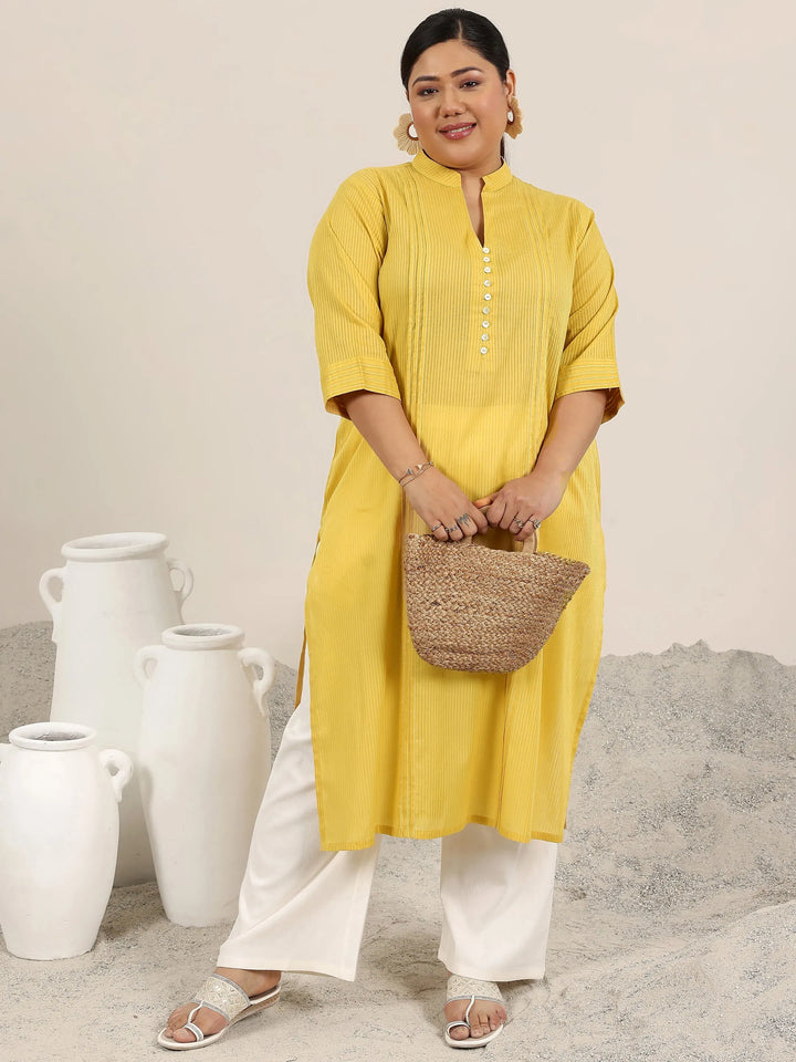Libas Extra Love collection features our signature designs in comfortable plus sizes. Our yellow cotton printed straight kurta features a mandarin-notched neckline and three-quarter sleeves. Highlighted with a striped pattern, stylish buttons and pintuck detailing, this style is ideal for casual outings.