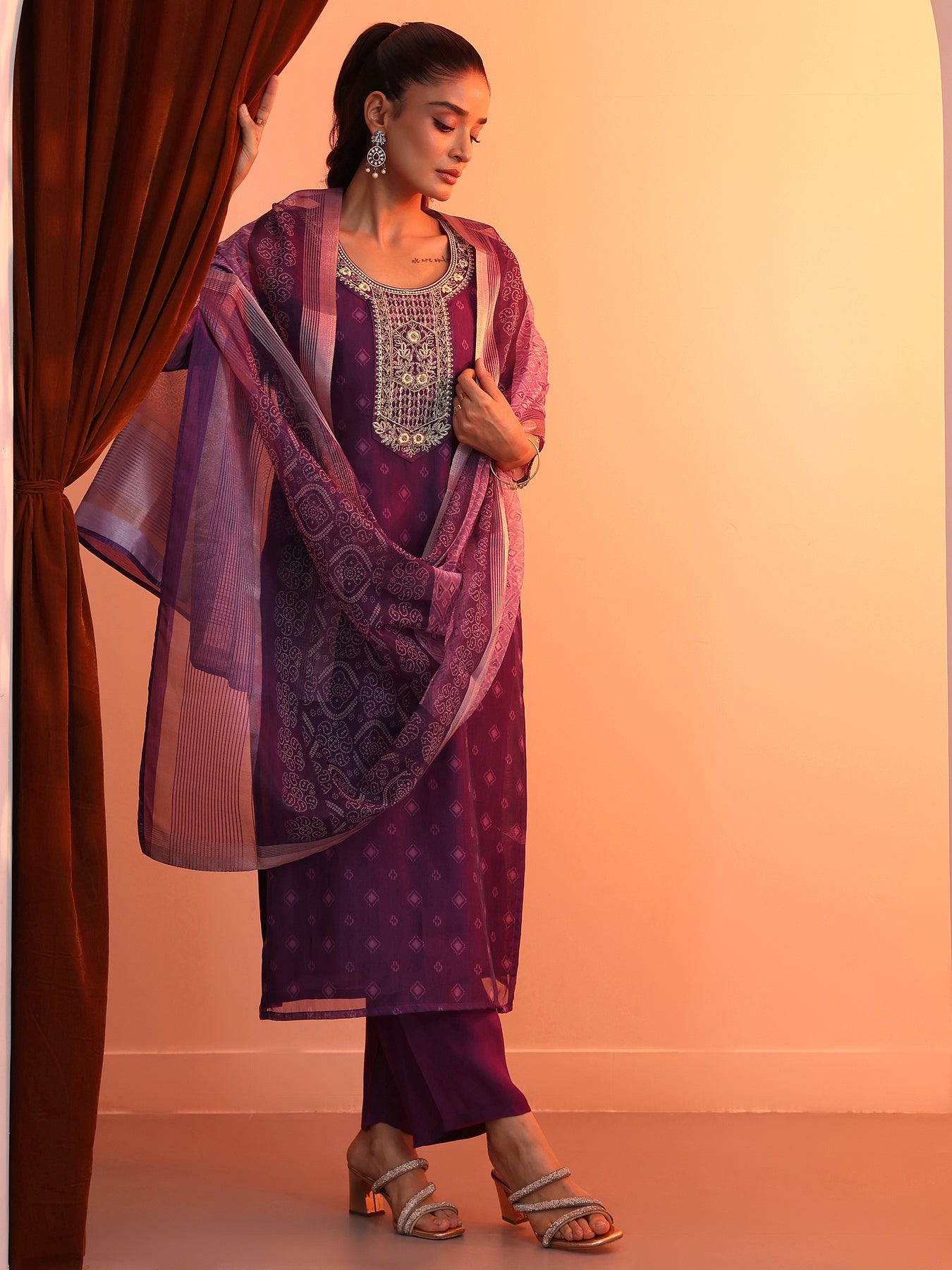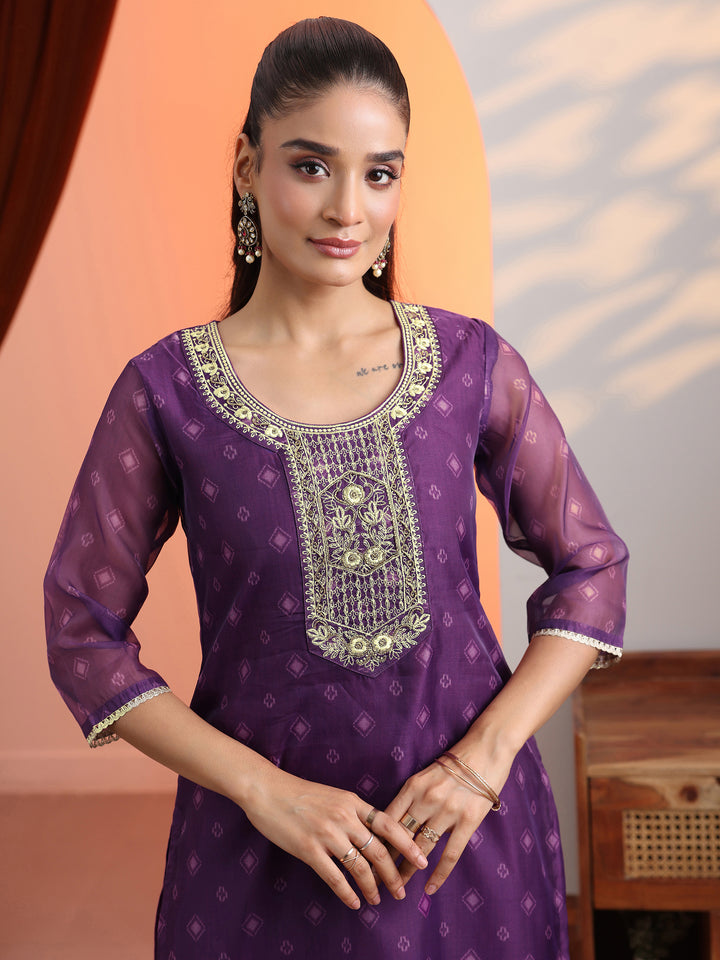 Our 3-piece purple organza straight-fit kurta set features a round neckline, regular sleeves, and a statement yoke. Complemented with lining and straight pants with a partially elasticated waistband and 2 pockets, and a printed dupatta. Adorned with embroidered ethnic motif prints, this style is perfect for festive wear.