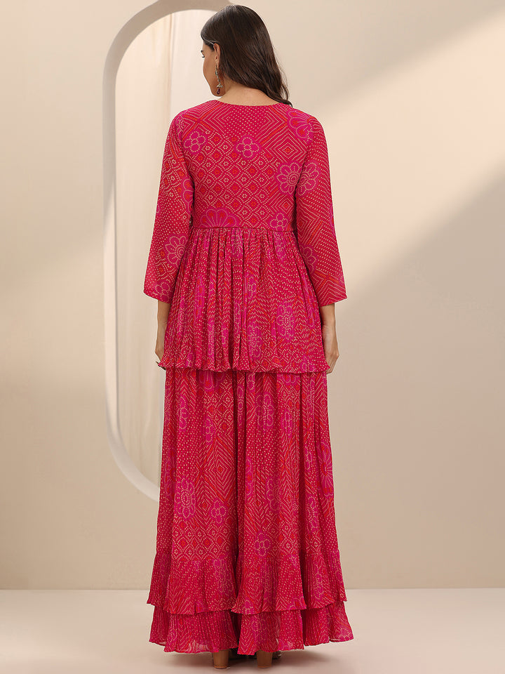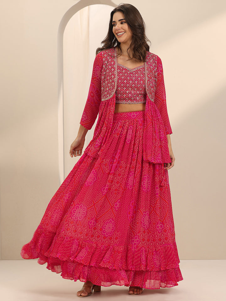 Our 3-piece Pink printed Silk Blend co-ord set features a Straight-fit Top with a Round Neck neckline and Three-quarter sleeves. Complemented with matching Skirt with Elasticated waistband. Highlighted with Printed, this style is perfect for Festive.