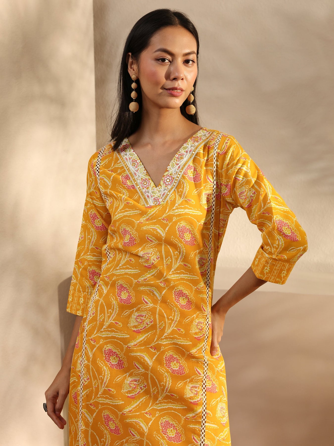 Our 3-piece yellow cotton A-line kurta set features a V-neckline, regular sleeves, and statement yoke. Complemented with straight pants with a partially elasticated waistband and 2 pockets, and a printed dupatta. Adorned with floral printed, this style is perfect for festive occasions.