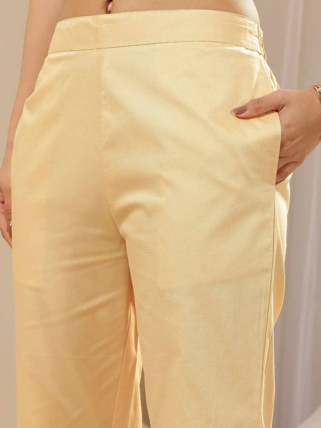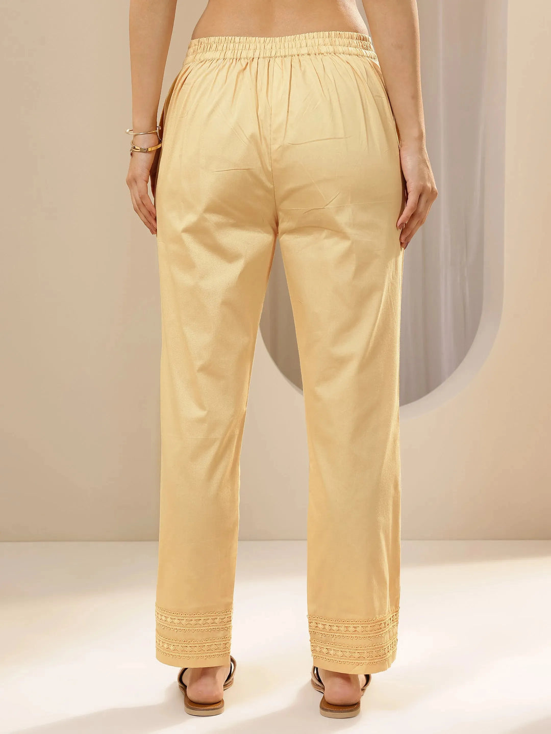 Our beige cotton trousers feature a slip-on closure and 2 pockets. Adorned with solid embellishments, this intricate style is perfect for casual wear.