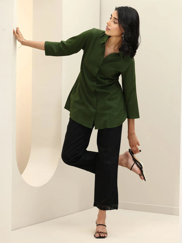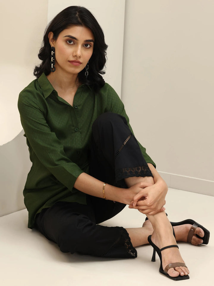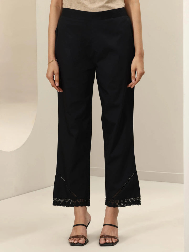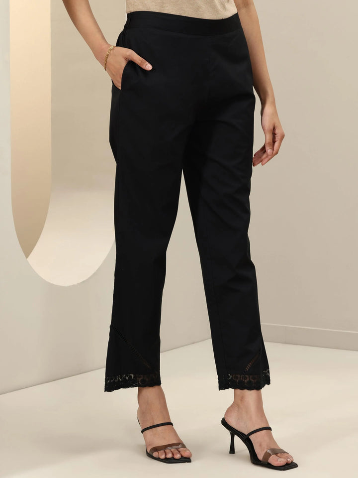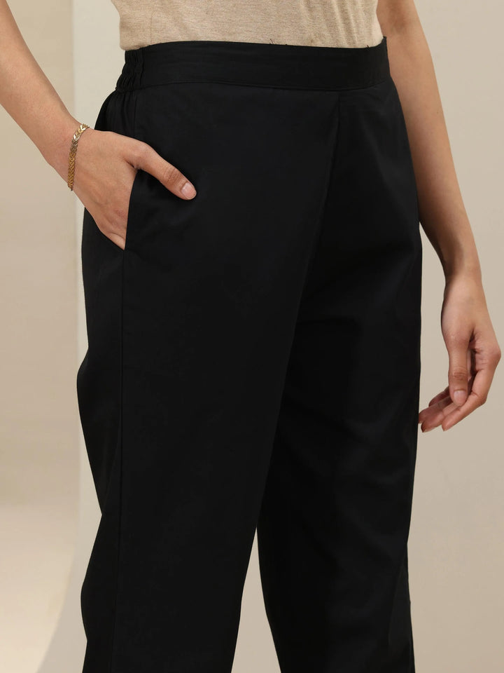 Our black cotton trousers feature a slip-on closure and 2 pockets. Adorned with self design, this intricate style is perfect for casual wear.