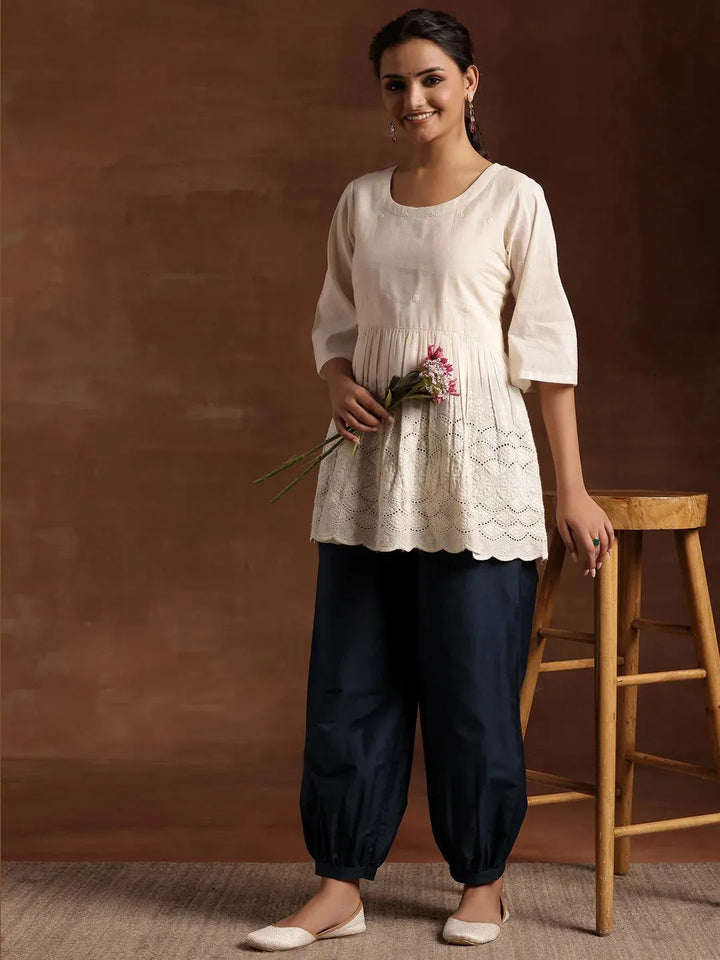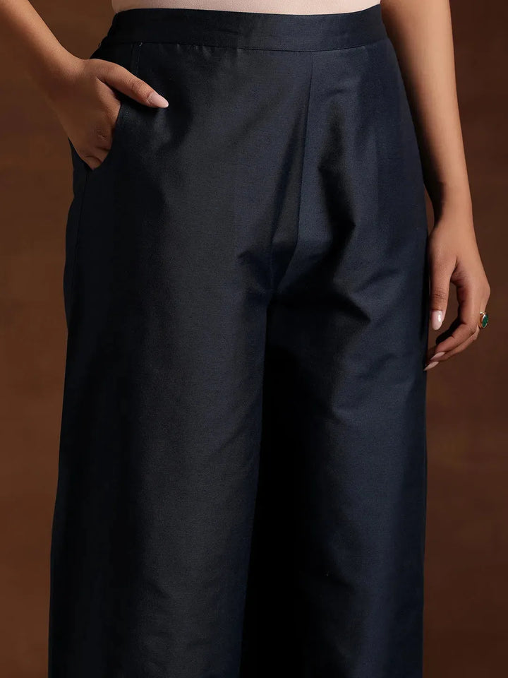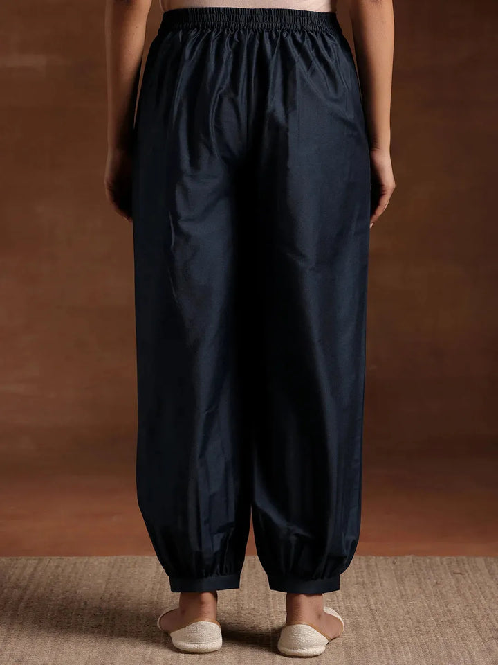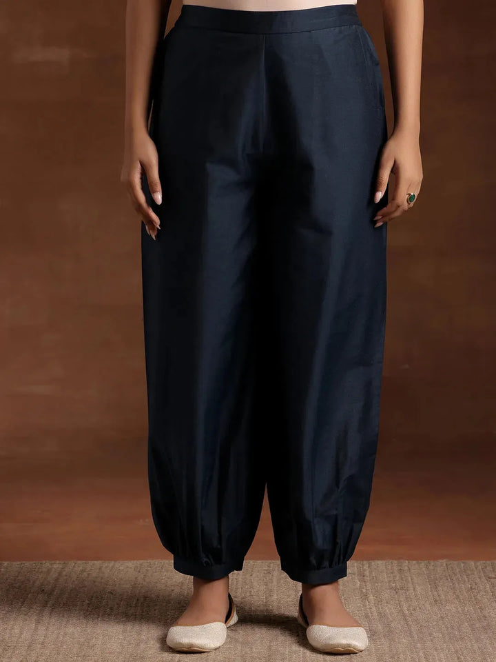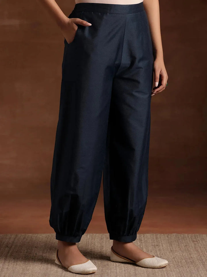 Our blue solid silk hem-cuffed Salwar features a partially elasticated waistband and roomy pockets. Crafted with attention to detail, this elegant style is perfect for work and beyond.