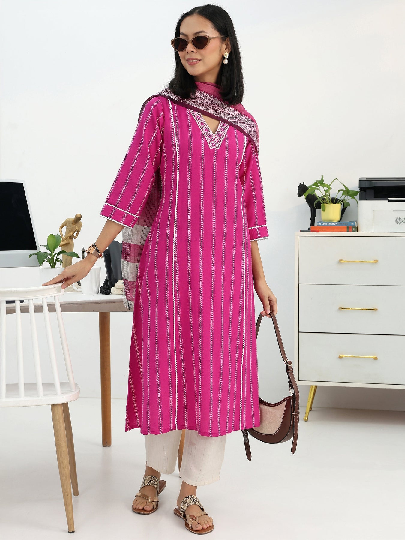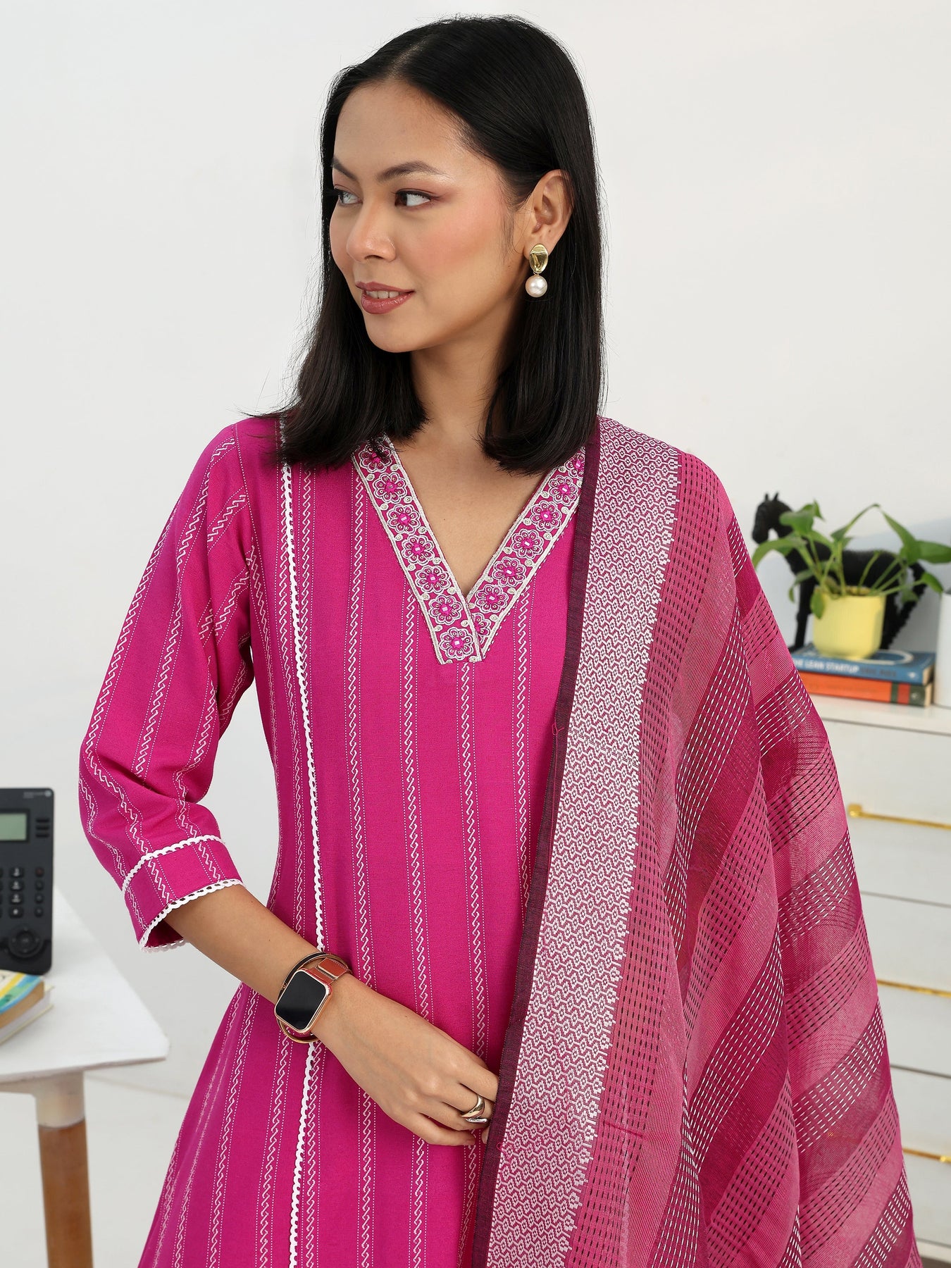 Our 3-piece pink cotton blend a-line kurta set features a V-neckline, regular sleeves, and statement yoke. Complemented with straight pants with a partially elasticated waistband and 2 pockets, and a woven design dupatta. Adorned with ethnic motif woven design, this style is perfect for Work Wear and Casual Wear.