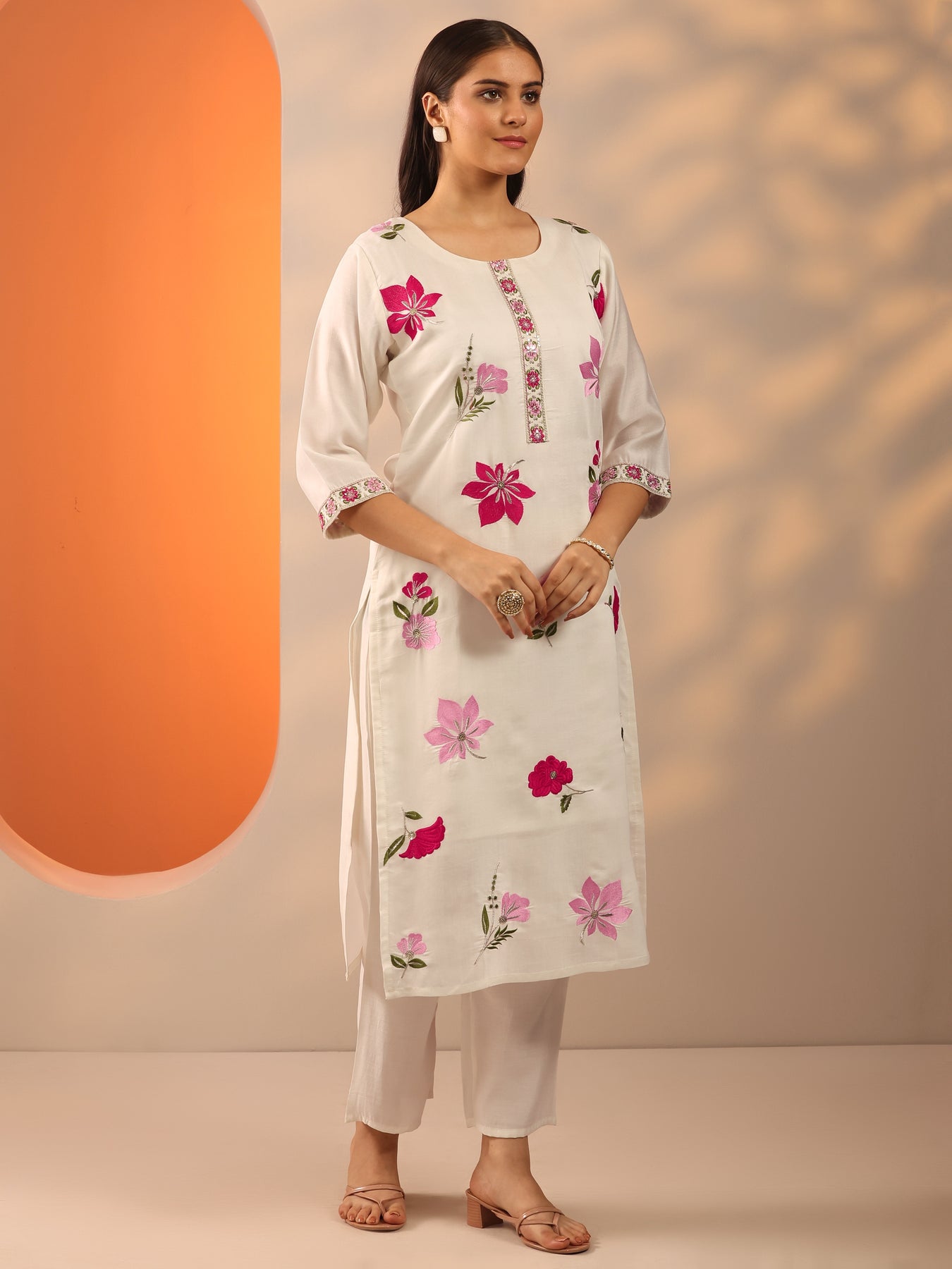 Our 3-piece white and pink silk blend kurta set features a straight-fit design with a round neckline, regular sleeves, and a statement yoke. Complemented with lining and straight pants with a partially elasticated waistband and 2 pockets, and a solid dupatta. Adorned with floral embroidered accents, this style is perfect for casual occasions.