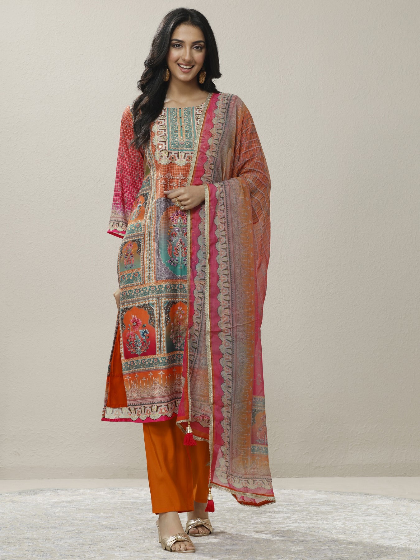 Orange Printed Crepe Straight Suit Set With Dupatta
