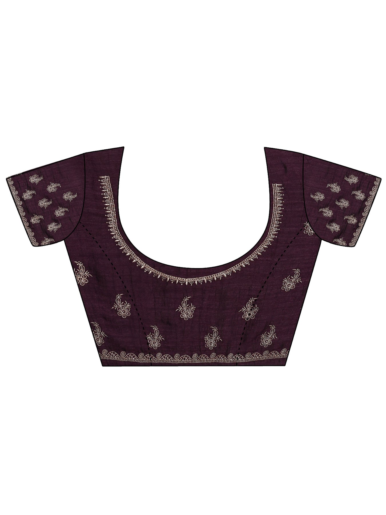 Our deep purple printed silk blend saree features captivating embellishments. Complemented with a stitched blouse. This charming saree is perfect for special occasions.