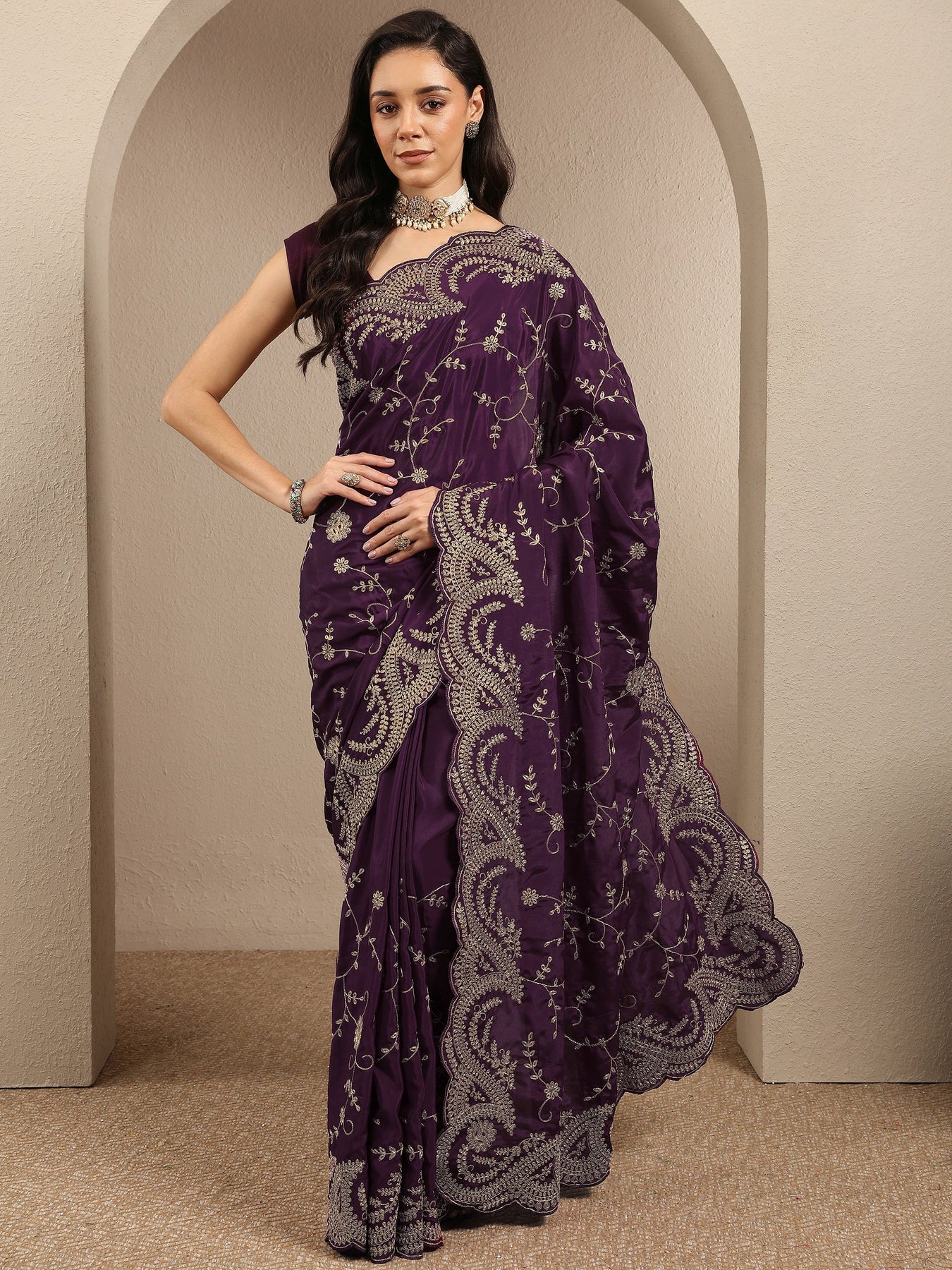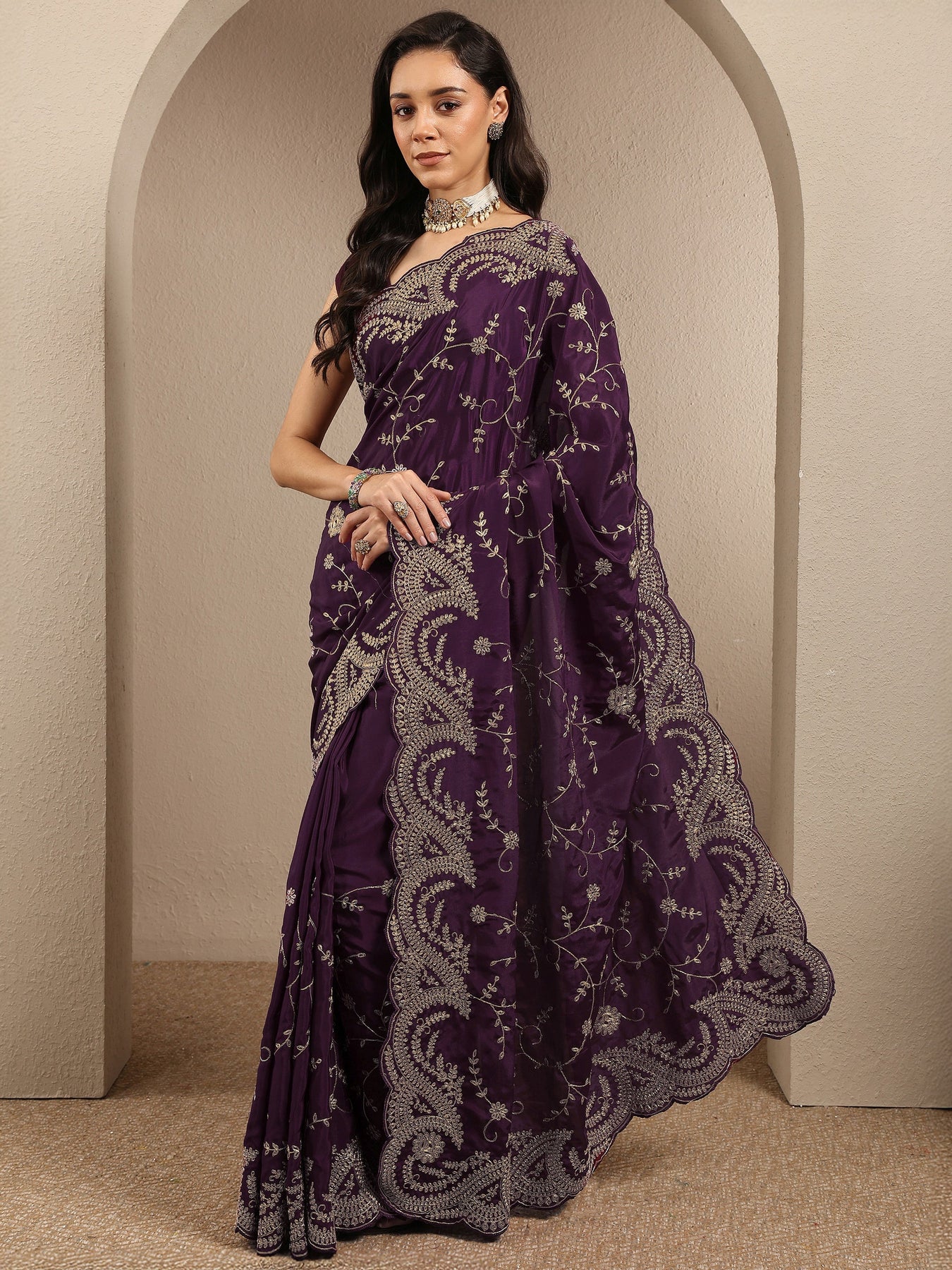 Burgundy Embroidered Silk Blend Saree With Unstitched Blouse Piece