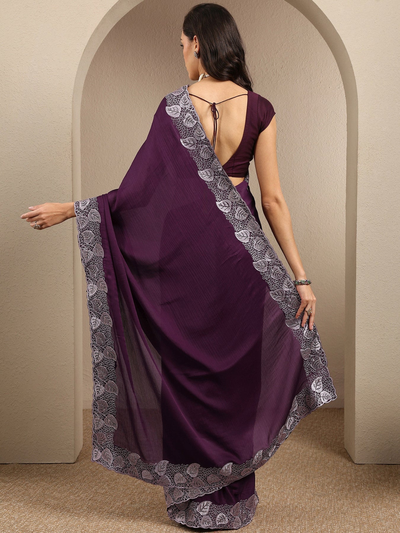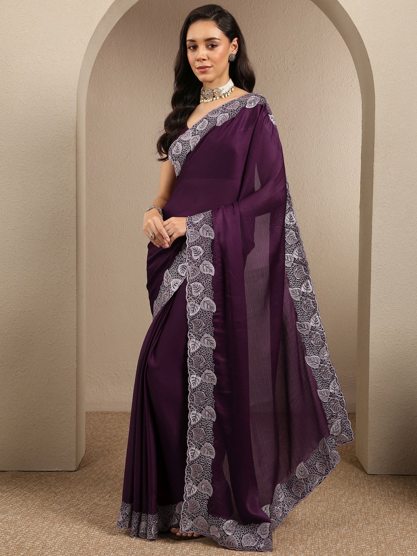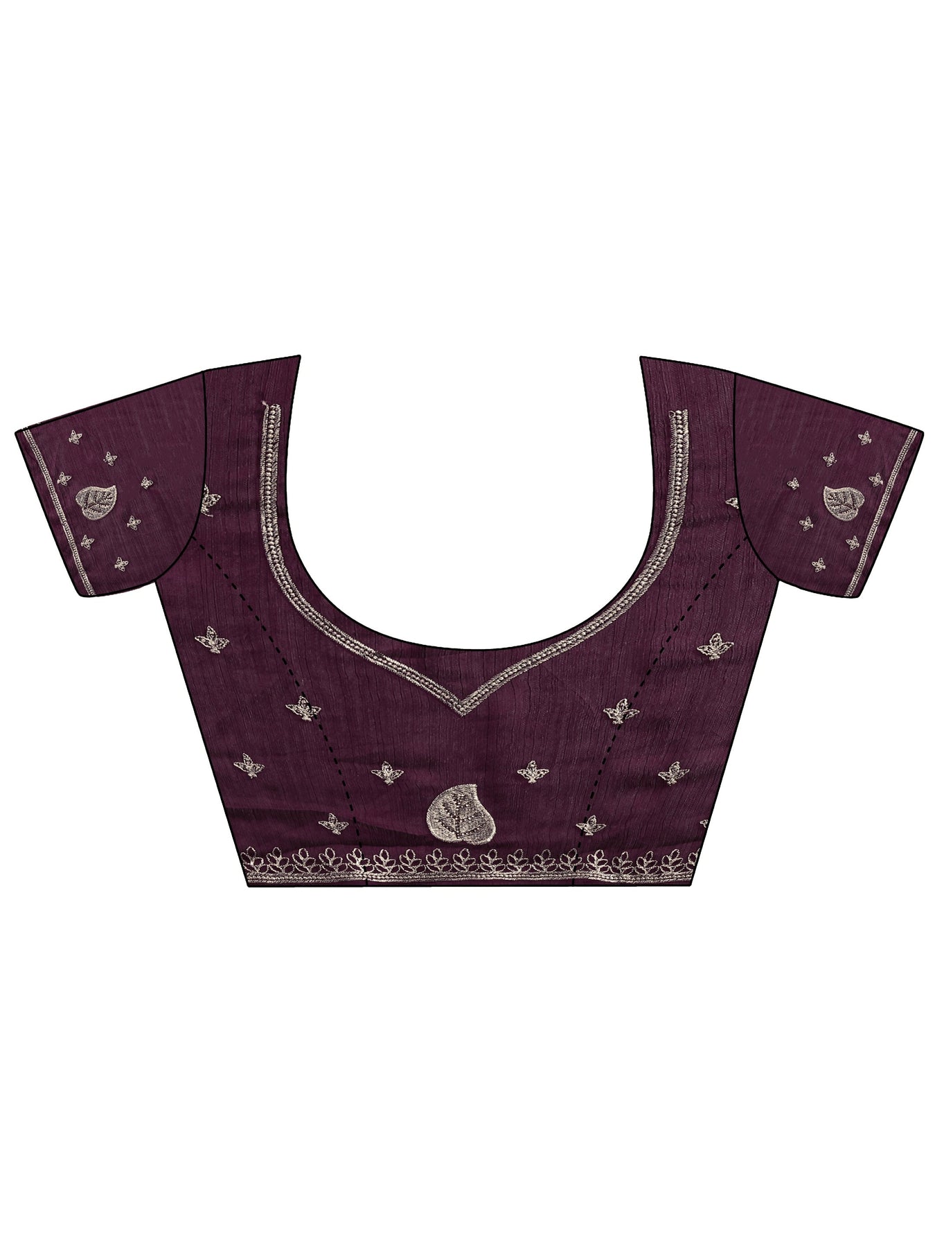 Our purple printed silk blend saree features captivating embellishments. Complemented with a stitched blouse. This charming saree is perfect for special occasions.