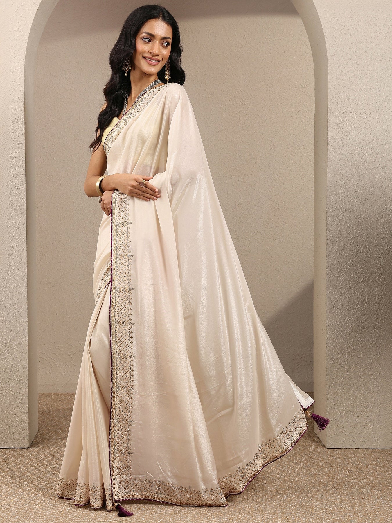 Our off white printed silk blend saree features captivating embellishments. Complemented with a Unstitched blouse piece.. This charming saree is perfect for special occasions.