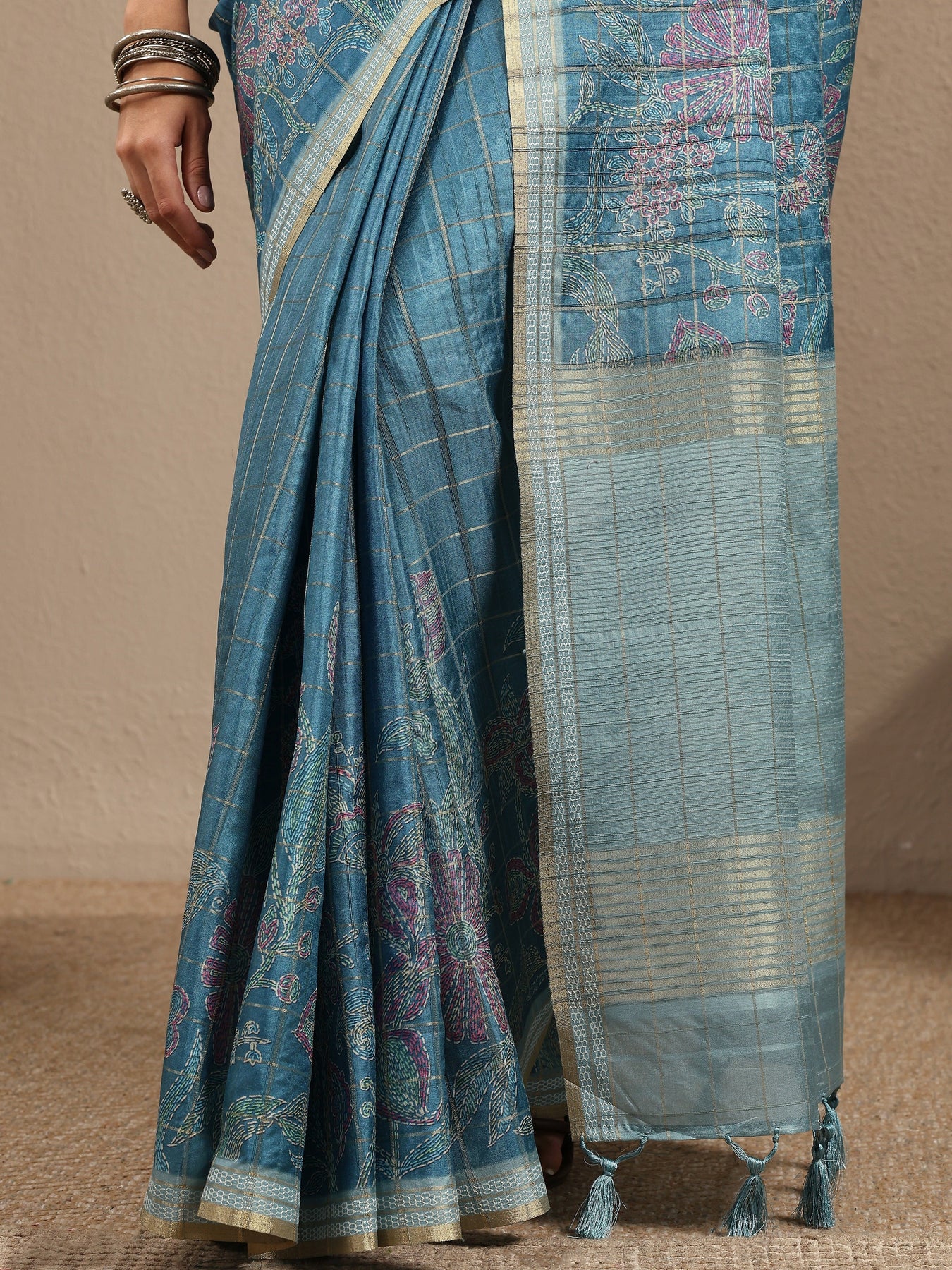 Our Turquoise Blue printed Silk blend saree features captivating floral print. Complemented with a Unstitched blouse piece.. This charming saree is perfect for festive occasions.
