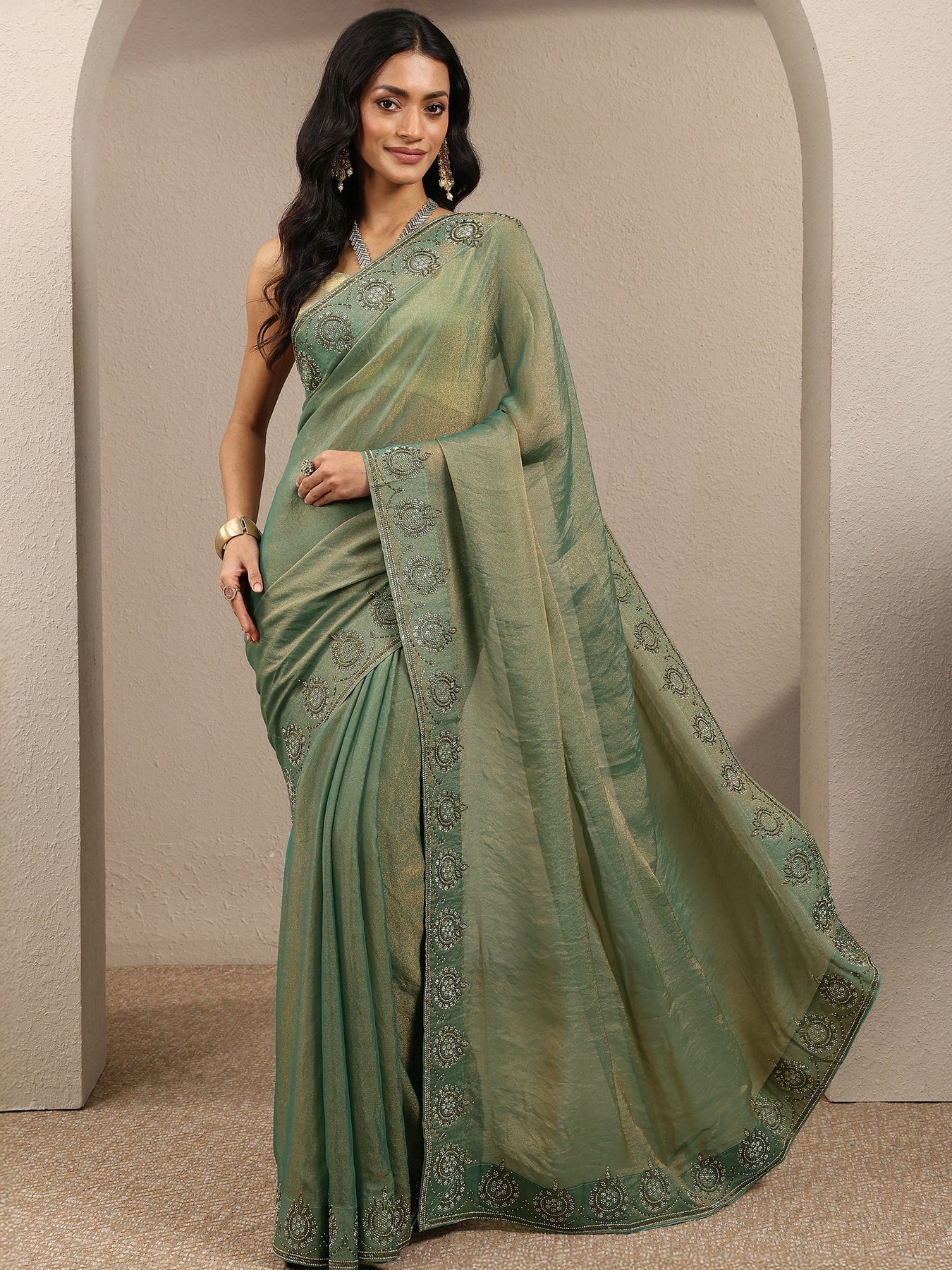 Green Solid Silk Blend Saree With Unstitched Blouse Piece
