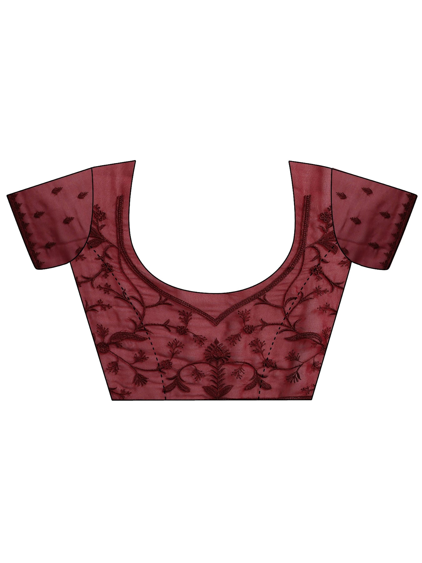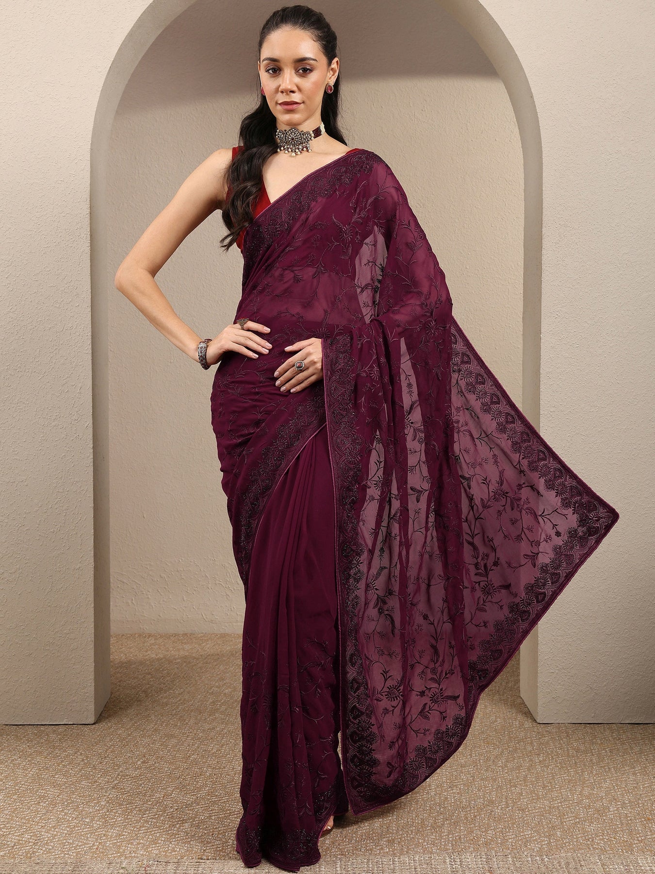 Maroon Embroidered Georgette Saree With Unstitched Blouse Piece