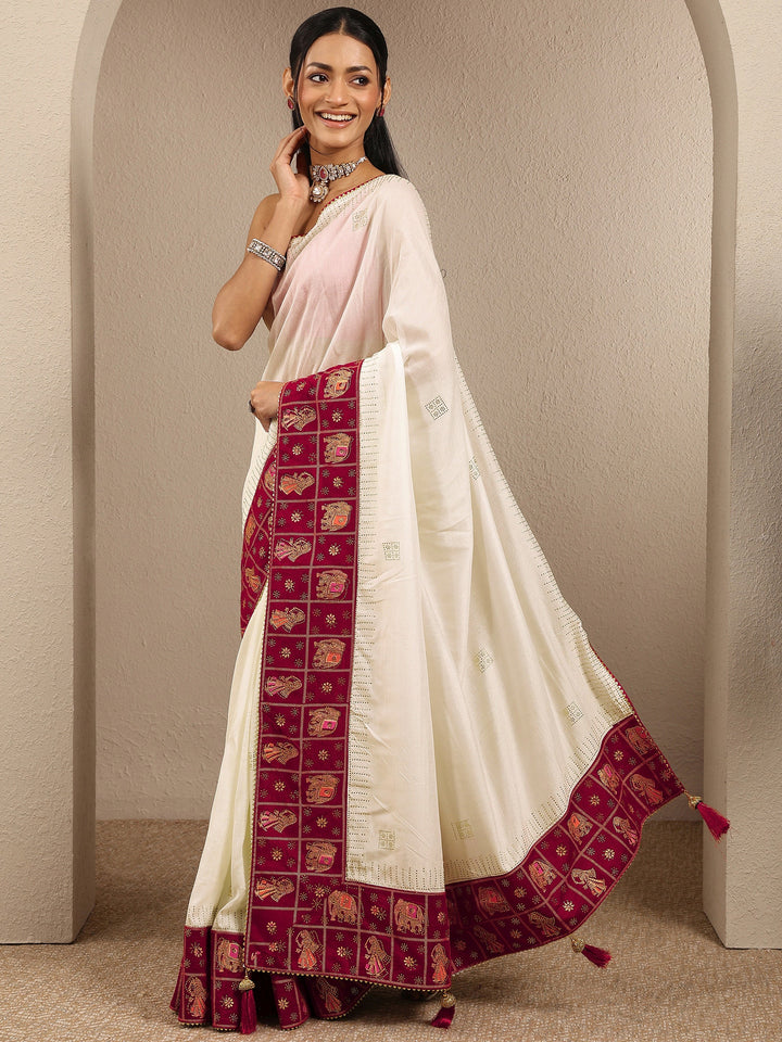 Off White Embellished Silk Blend Saree With Unstitched Blouse Piece