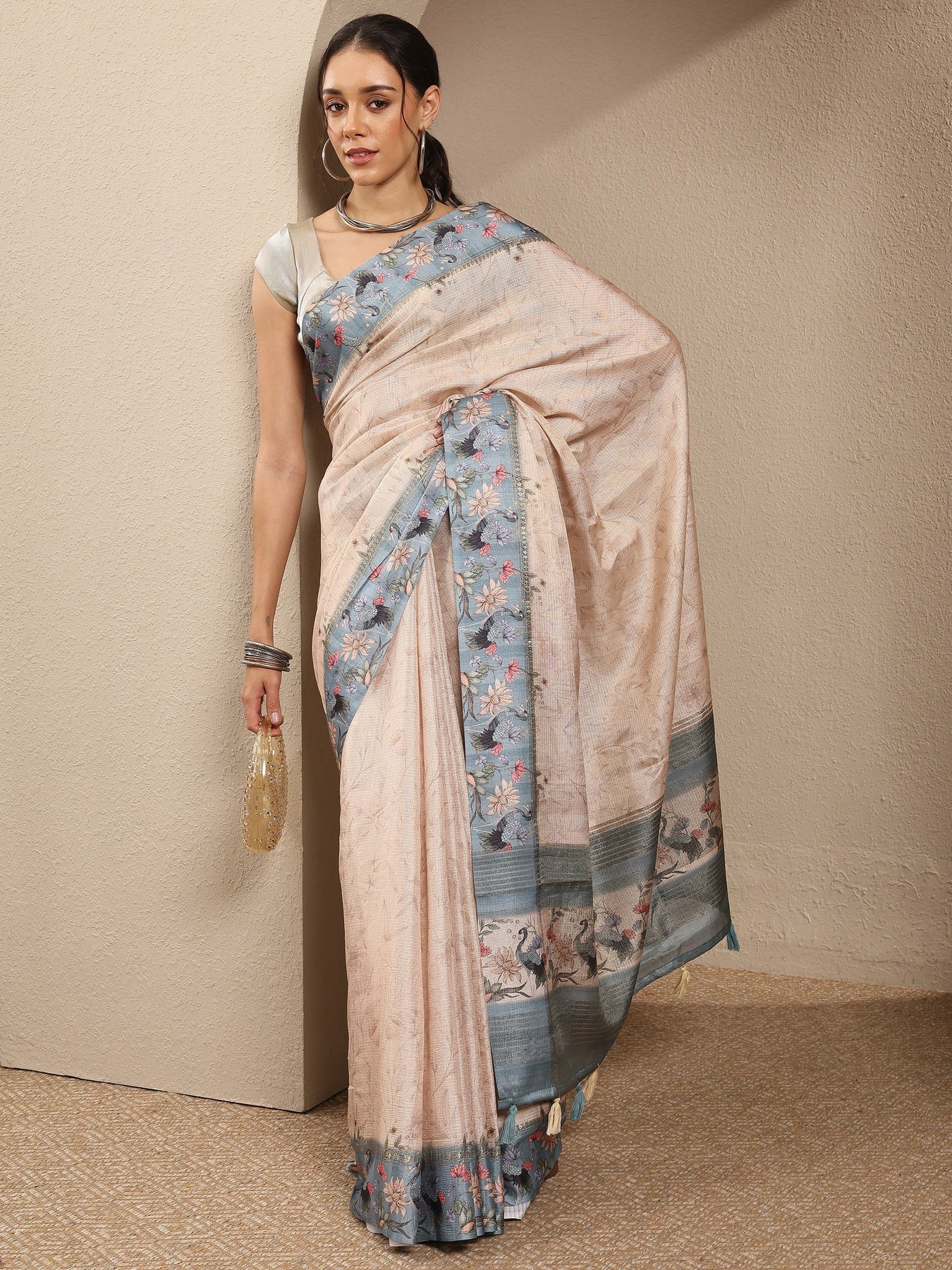 Our beige printed silk blend saree features captivating floral print. Complemented with a Unstitched blouse piece.. This charming saree is perfect for festive occasions.