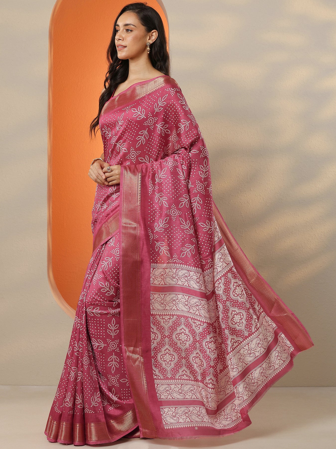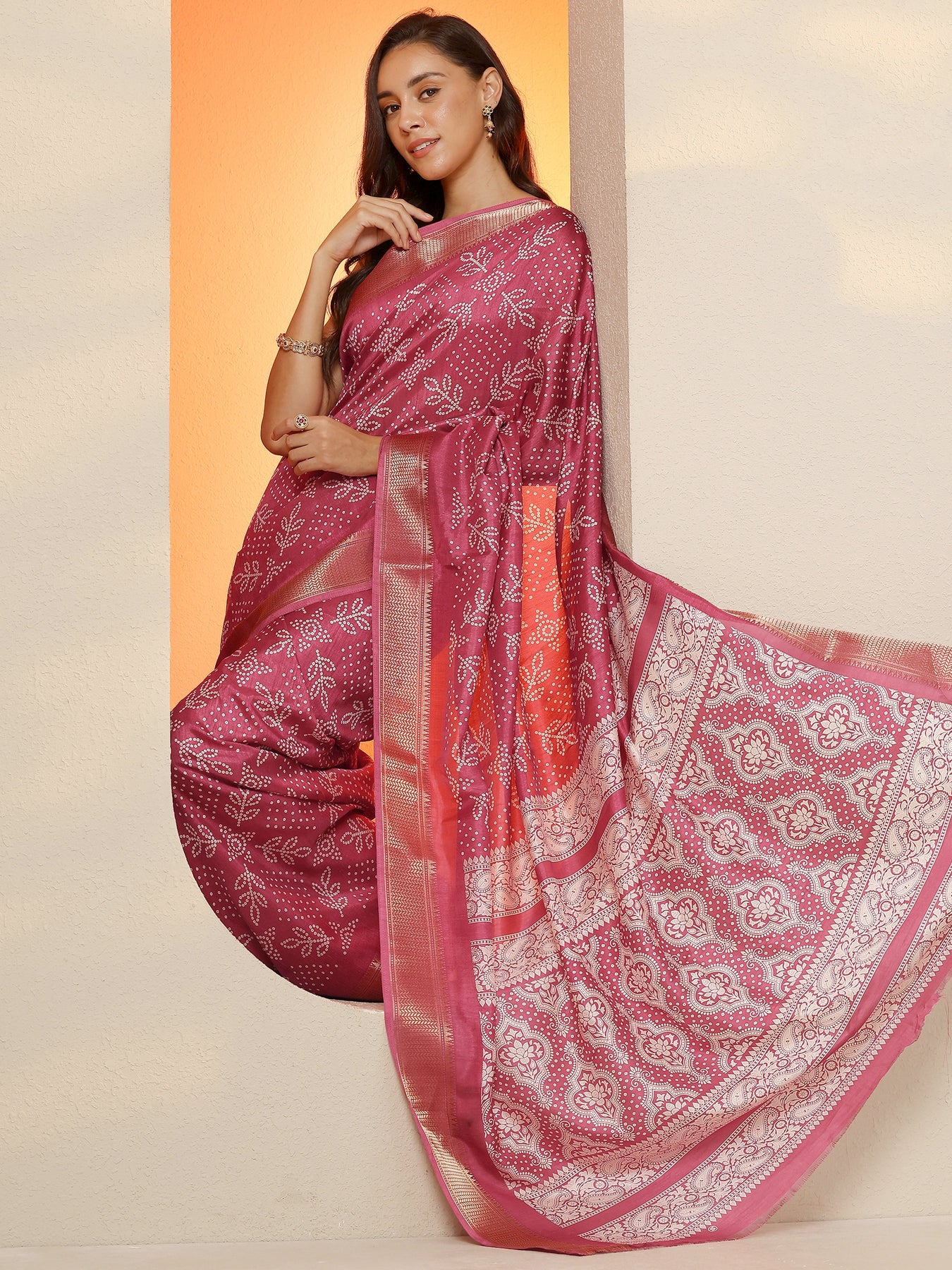 Pink Bandhani Printed Silk Blend Saree With Unstitched Blouse Piece