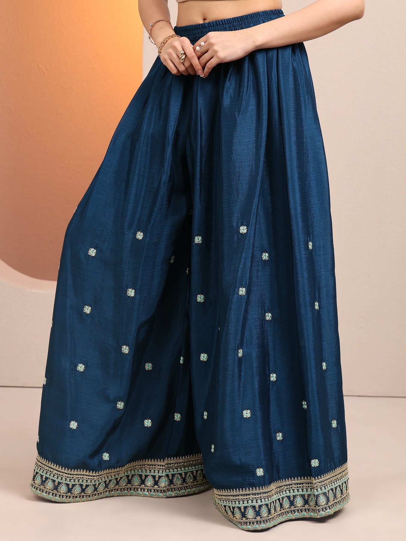 Our 3-piece Navy Blue Chinon Straight-Fit Kurta Set features a Round Neckline, Regular Sleeves, and statement yoke. Complemented with Lining and palazzo with a Partially Elasticated waistband, and an Embroidered dupatta. Adorned with ethnic motif embroidered, this style is perfect for Dark Festive.