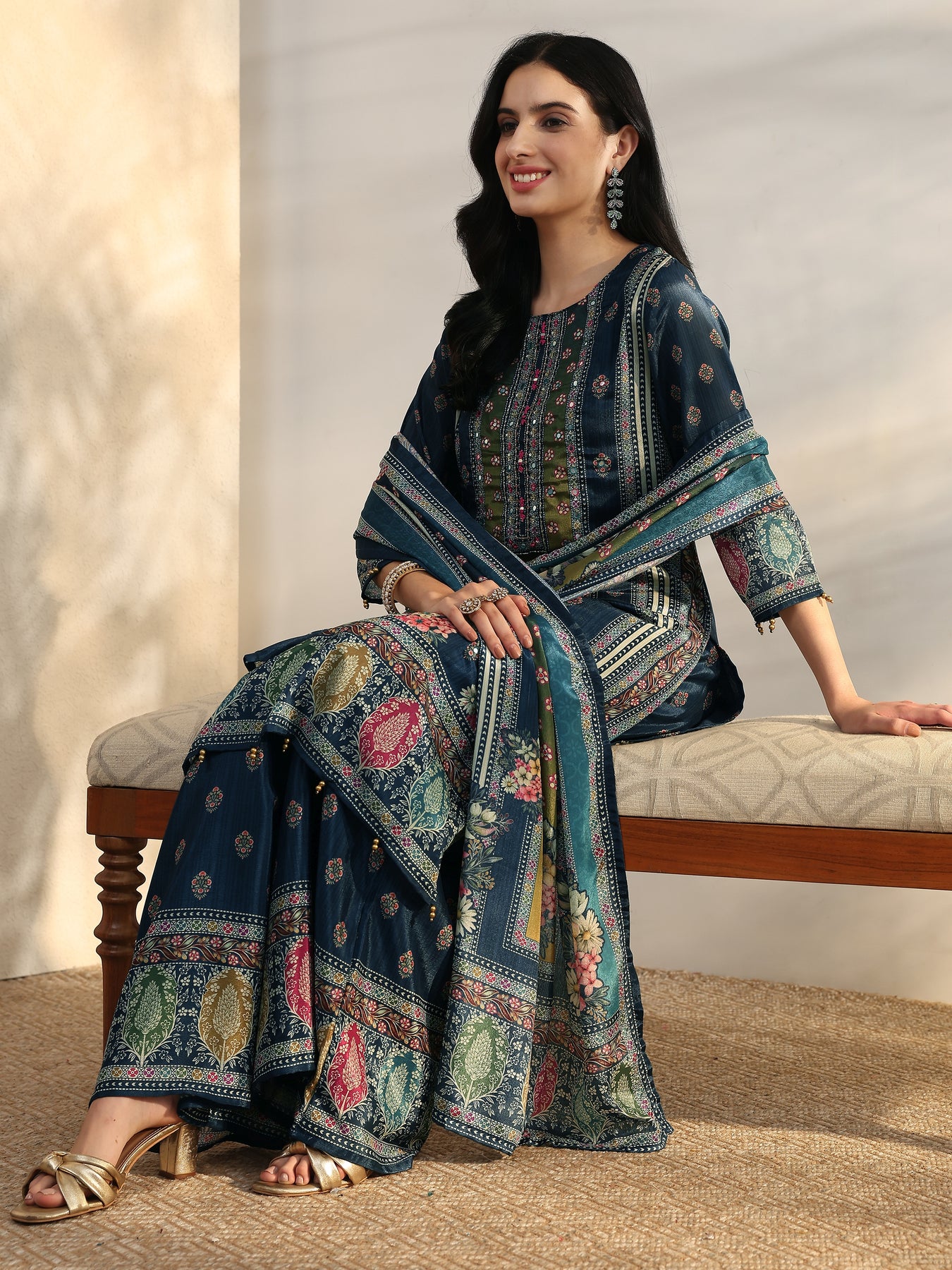 Our 3-piece Navy Blue Chinon Straight-Fit Kurta Set features a Round Neckline, Regular Sleeves, and statement yoke. Complemented with Palazzo Pants with a Partially Elasticated waistband and 2 pockets, and a Printed dupatta. Adorned with floral printed, this style is perfect for Dark Festive.