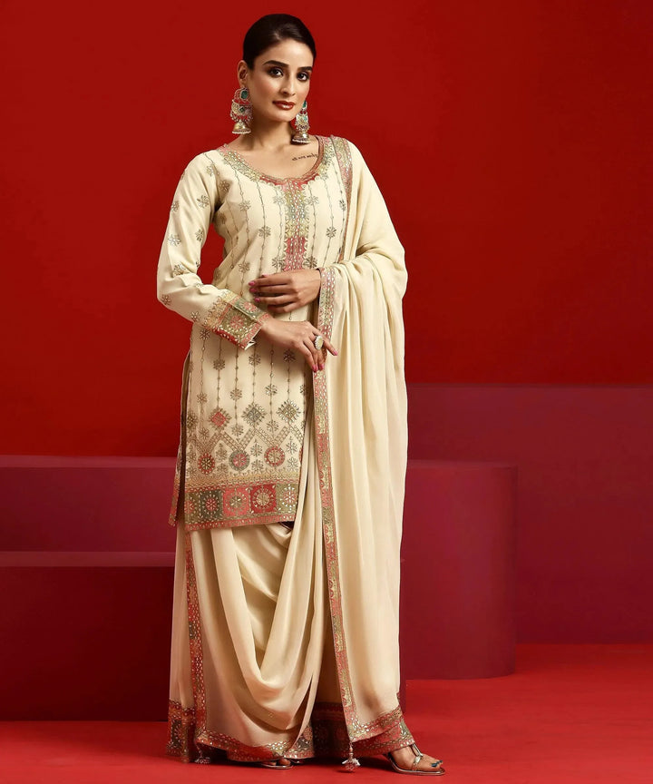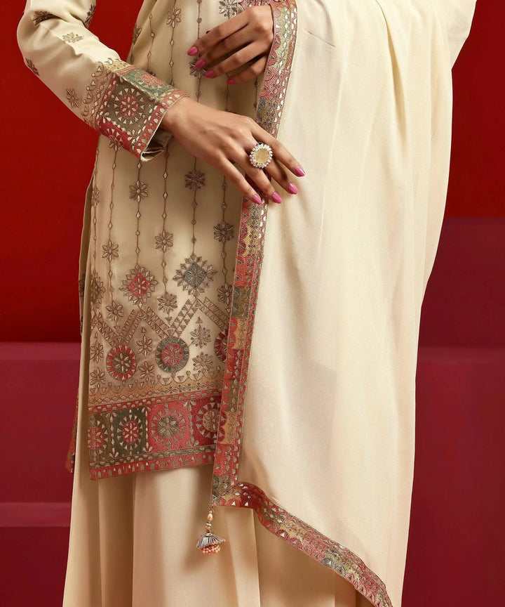 Our 3-piece beige embroidered georgette suit set features a straight-fit kurta with a round neckline, comfortable full sleeves, and a statement yoke. Complemented with palazzo pants with a partially elasticated waistband and a dupatta. Adorned with intricate thread work, sequins, and delicate tassels, this style is perfect for festive celebrations.
