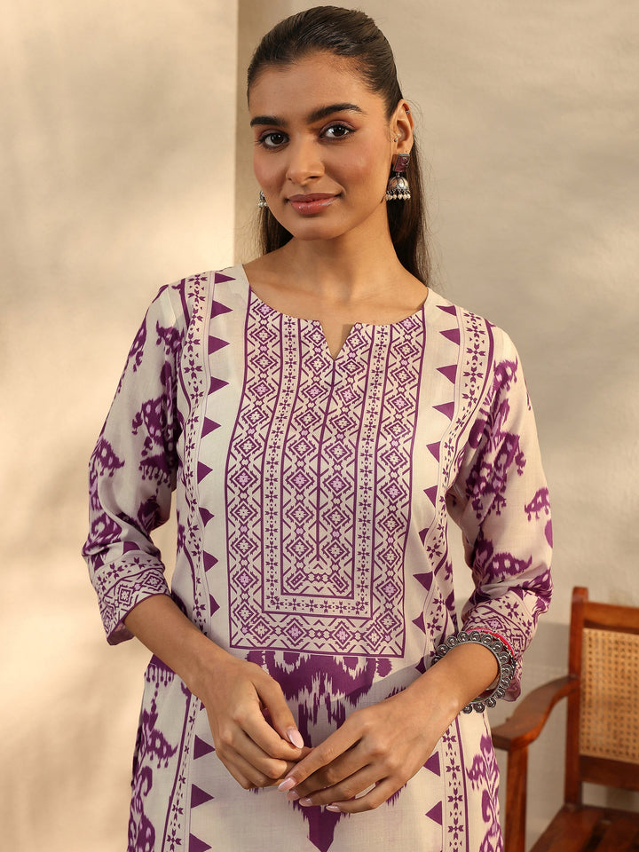 Our 3-piece purple and off-white cotton blend straight-fit kurta set features a round neckline, regular sleeves, and statement yoke. Complemented with straight pants with a partially elasticated waistband and 2 pockets, and a printed dupatta. Adorned with ethnic motif printed, this style is perfect for festive occasions.