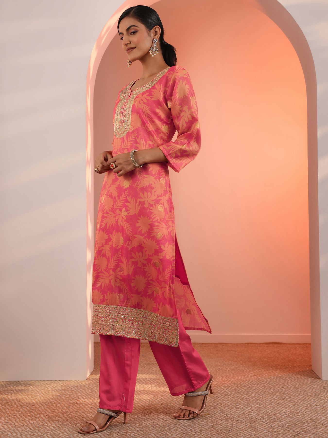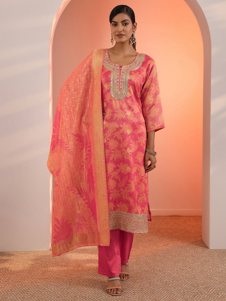 Orange Printed Silk Blend Straight Suit Set With Dupatta
